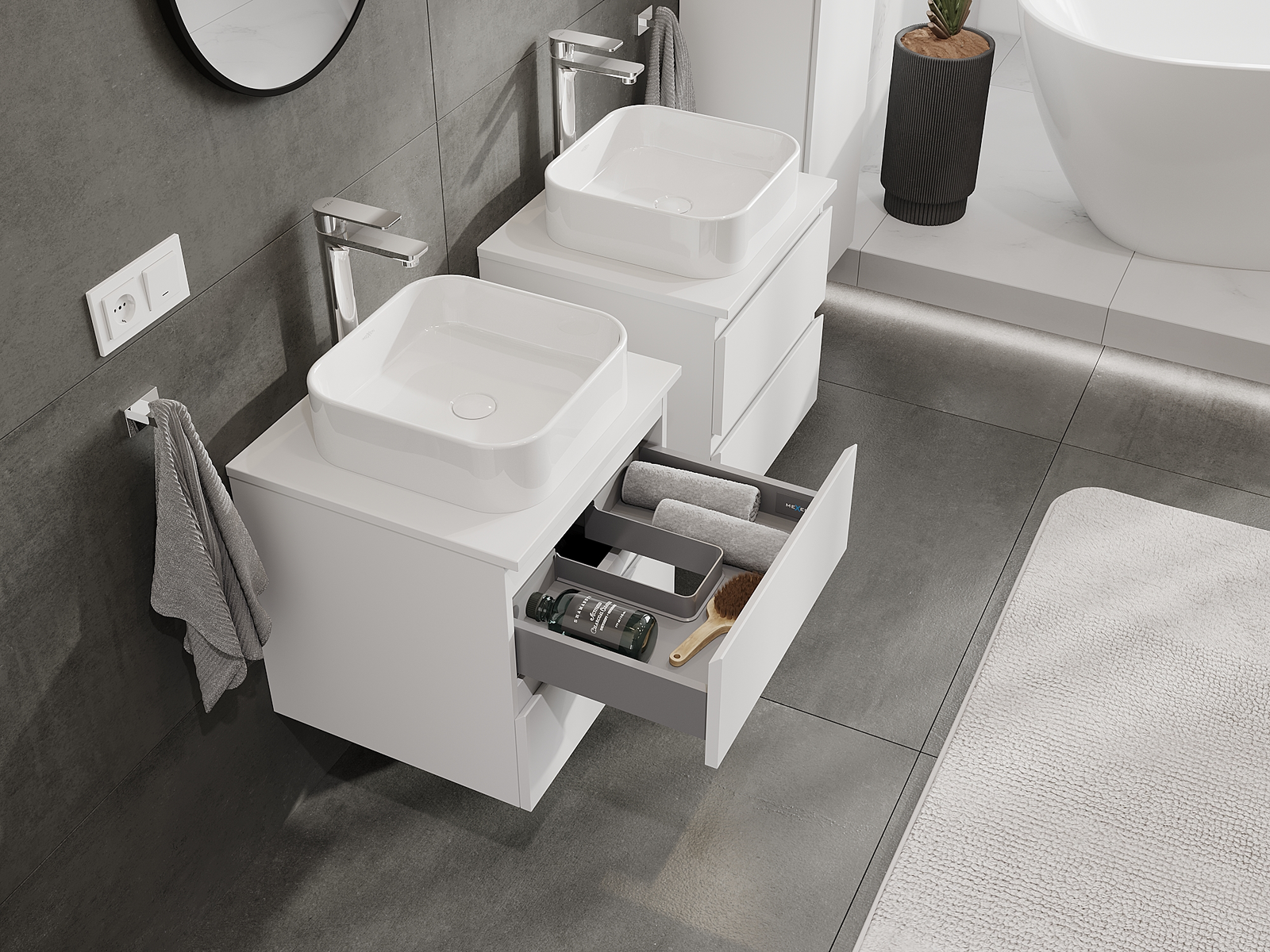 Výrez v zásuvke je navrhnutý tak, aby pojal sifón, ktorý je nevyhnutný v umývadlových inštaláciách. Vďaka tomu môže byť nábytok namontovaný plne funkčne, bez nutnosti vzdávať sa priestoru v zásuvke v prospech inštalácie.