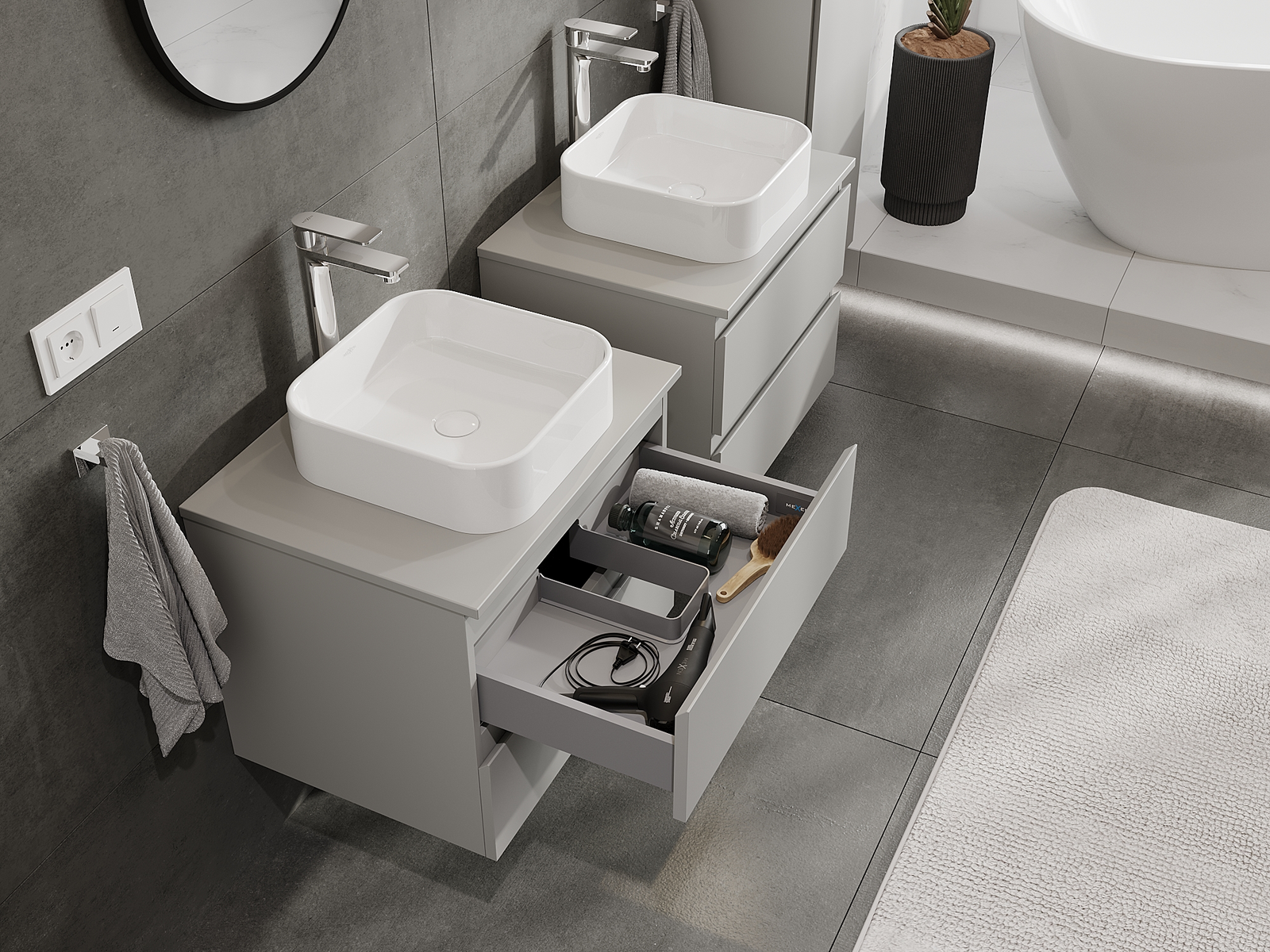 Výrez v zásuvke je navrhnutý tak, aby pojal sifón, ktorý je nevyhnutný v umývadlových inštaláciách. Vďaka tomu môže byť nábytok namontovaný plne funkčne, bez nutnosti vzdávať sa priestoru v zásuvke v prospech inštalácie.