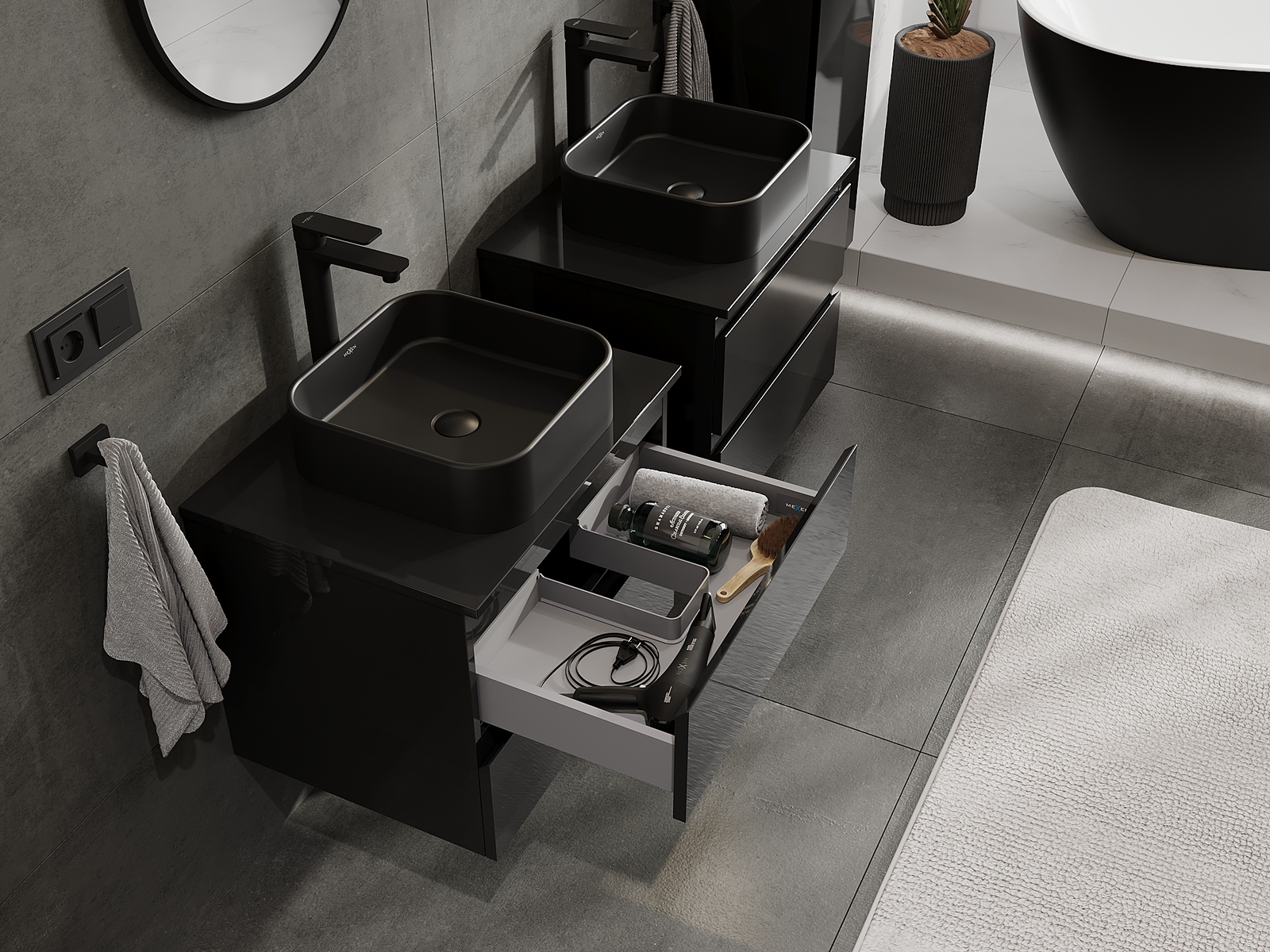 Výrez v zásuvke je navrhnutý tak, aby pojal sifón, ktorý je nevyhnutný v umývadlových inštaláciách. Vďaka tomu môže byť nábytok namontovaný plne funkčne, bez nutnosti vzdávať sa priestoru v zásuvke v prospech inštalácie.