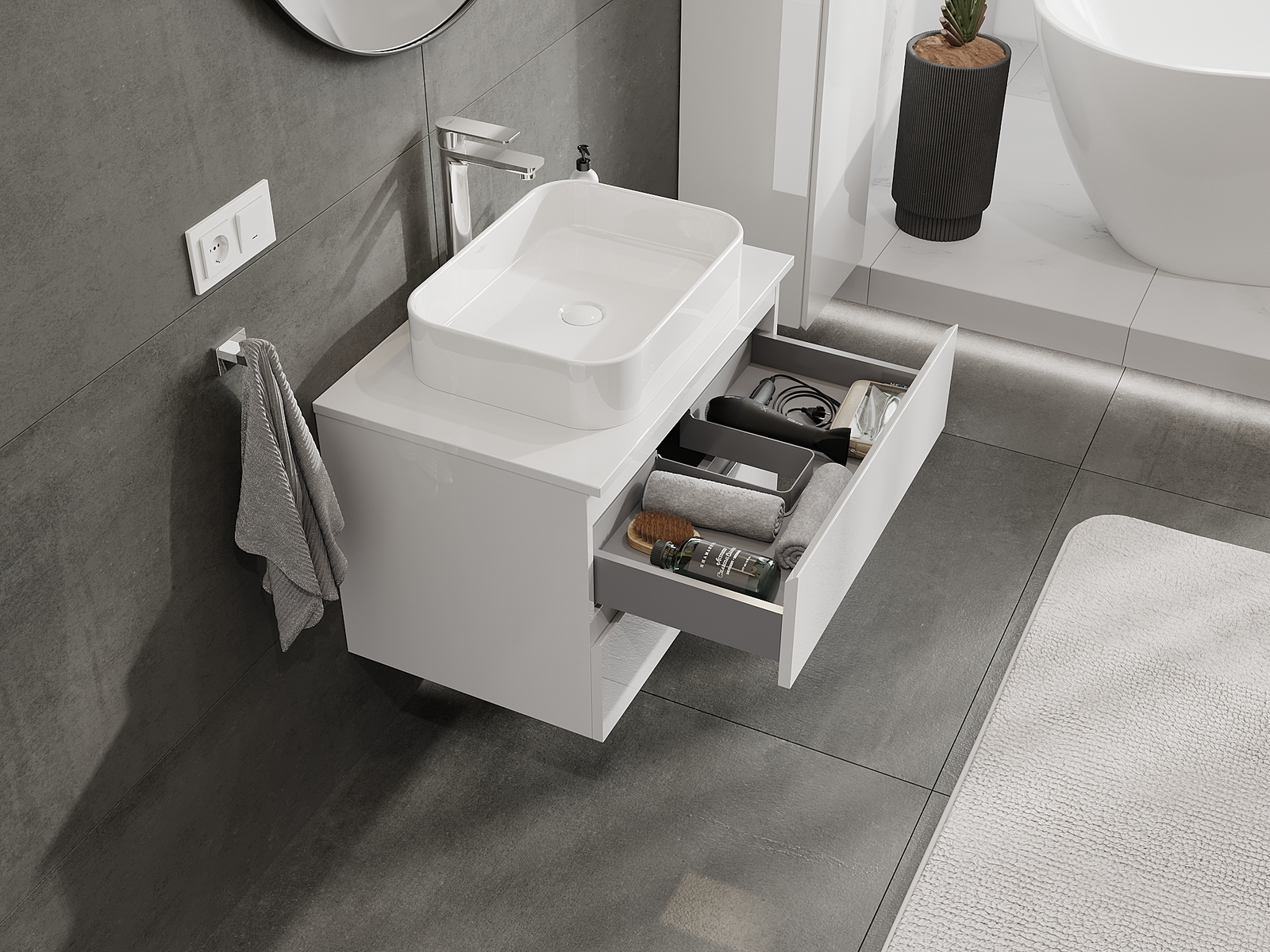 Výrez v zásuvke je navrhnutý tak, aby pojal sifón, ktorý je nevyhnutný v umývadlových inštaláciách. Vďaka tomu môže byť nábytok namontovaný plne funkčne, bez nutnosti vzdávať sa priestoru v zásuvke v prospech inštalácie.