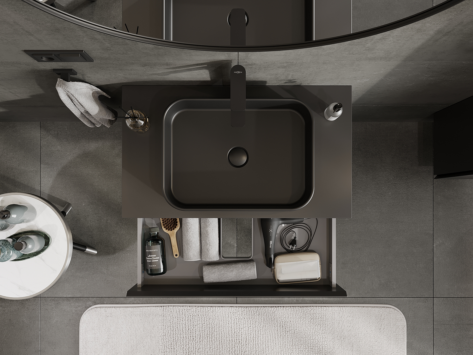 Výrez v zásuvke je navrhnutý tak, aby pojal sifón, ktorý je nevyhnutný v umývadlových inštaláciách. Vďaka tomu môže byť nábytok namontovaný plne funkčne, bez nutnosti vzdávať sa priestoru v zásuvke v prospech inštalácie.