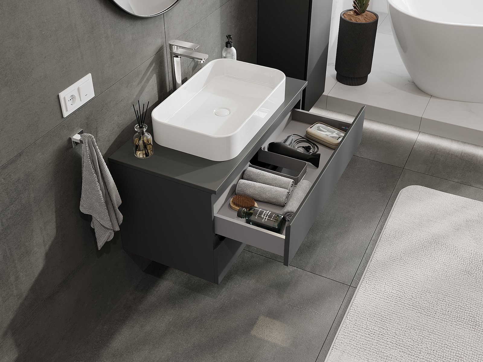 Výrez v zásuvke je navrhnutý tak, aby pojal sifón, ktorý je nevyhnutný v umývadlových inštaláciách. Vďaka tomu môže byť nábytok namontovaný plne funkčne, bez nutnosti vzdávať sa priestoru v zásuvke v prospech inštalácie.