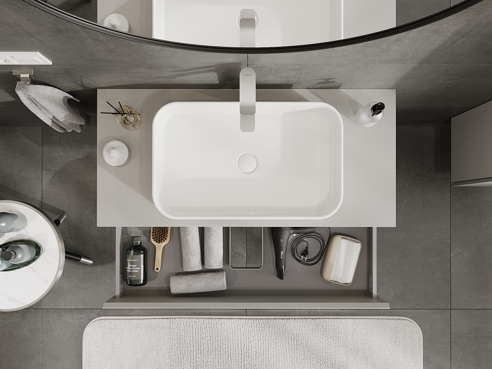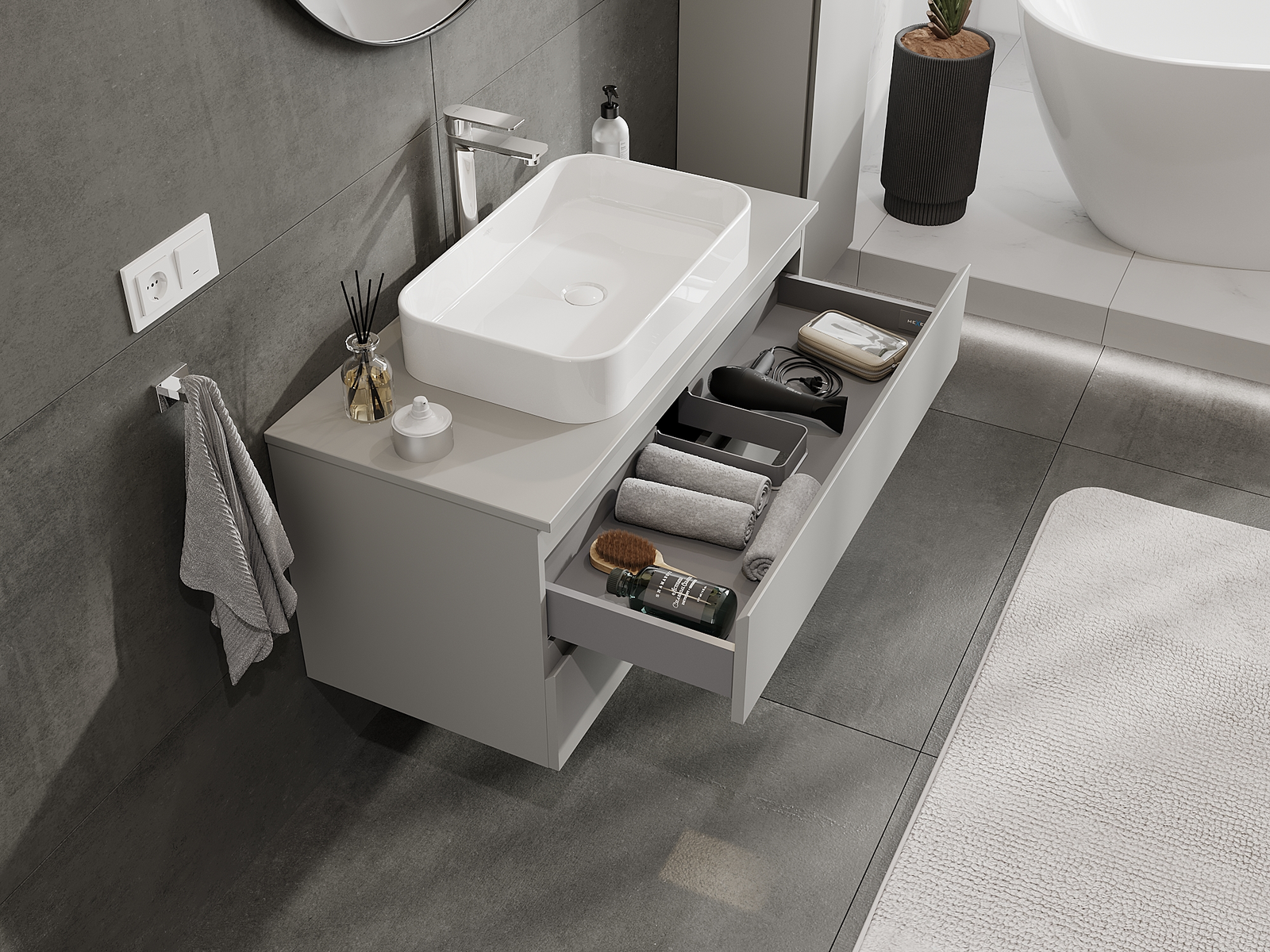 Výrez v zásuvke je navrhnutý tak, aby pojal sifón, ktorý je nevyhnutný v umývadlových inštaláciách. Vďaka tomu môže byť nábytok namontovaný plne funkčne, bez nutnosti vzdávať sa priestoru v zásuvke v prospech inštalácie.