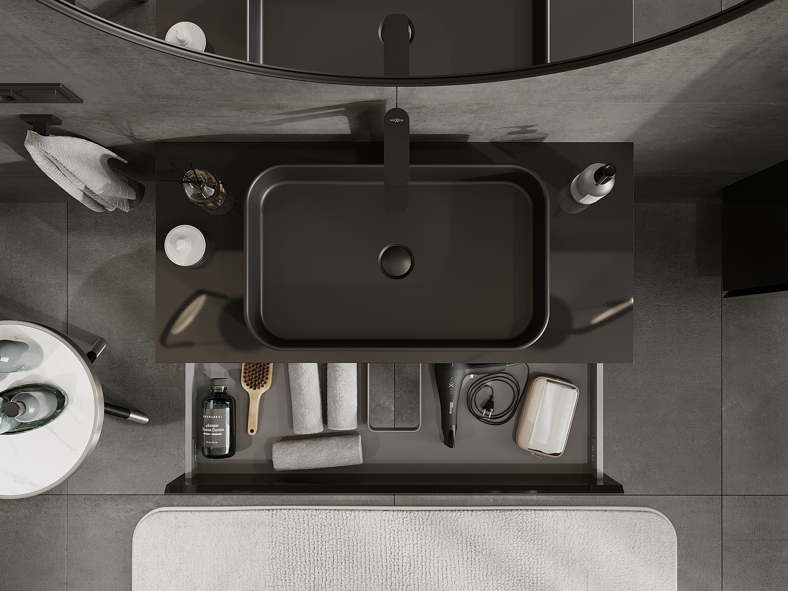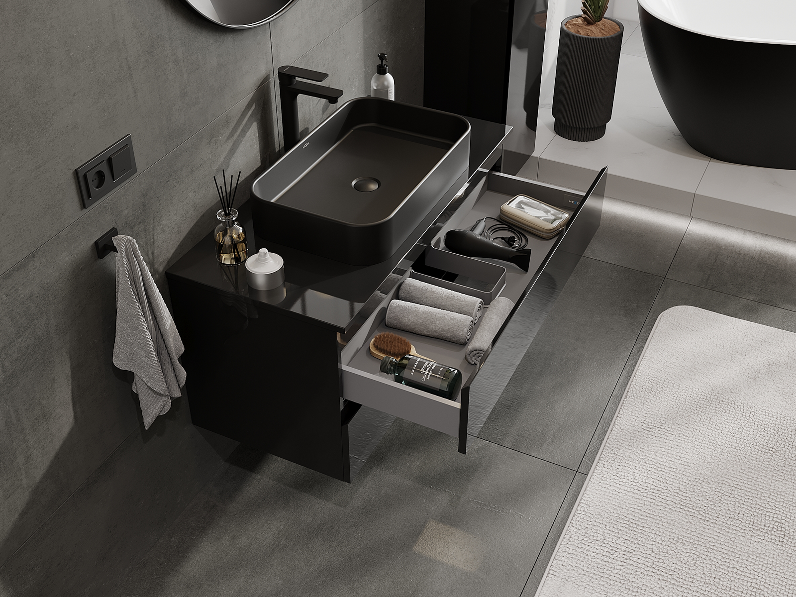 Výrez v zásuvke je navrhnutý tak, aby pojal sifón, ktorý je nevyhnutný v umývadlových inštaláciách. Vďaka tomu môže byť nábytok namontovaný plne funkčne, bez nutnosti vzdávať sa priestoru v zásuvke v prospech inštalácie.