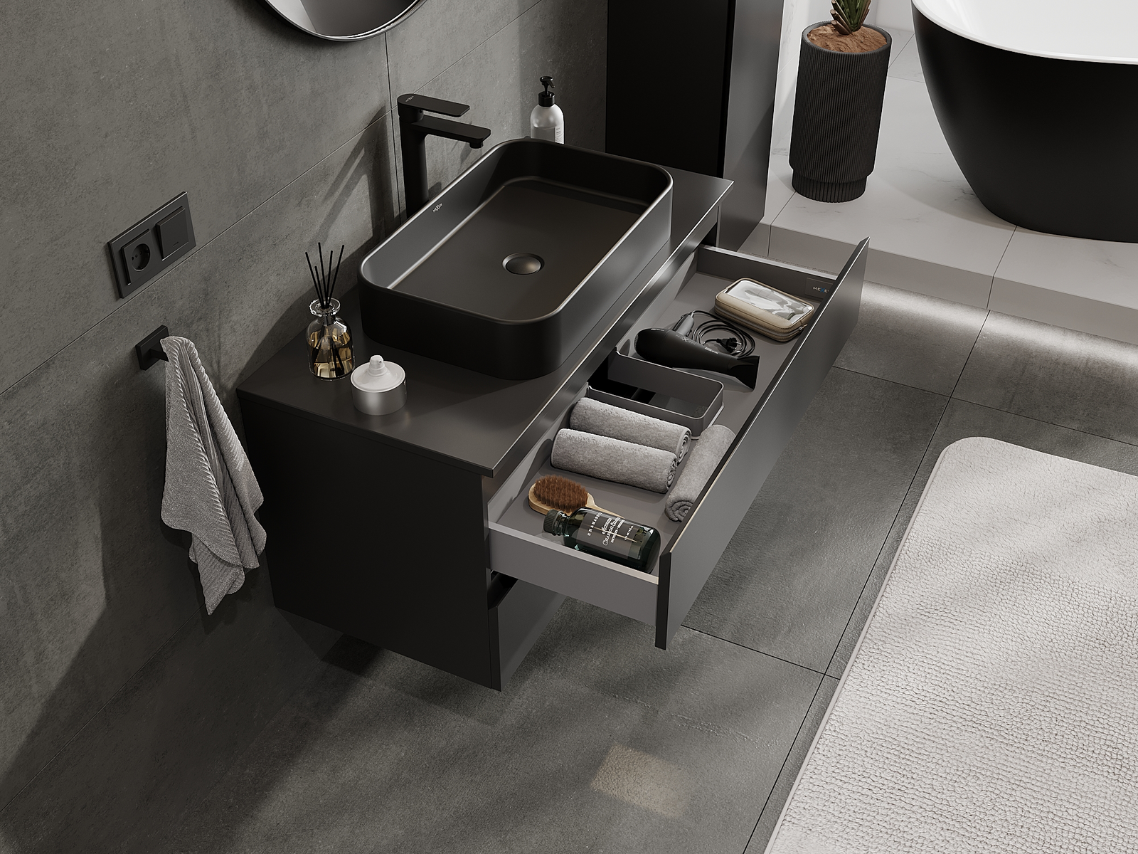 Výrez v zásuvke je navrhnutý tak, aby pojal sifón, ktorý je nevyhnutný v umývadlových inštaláciách. Vďaka tomu môže byť nábytok namontovaný plne funkčne, bez nutnosti vzdávať sa priestoru v zásuvke v prospech inštalácie.