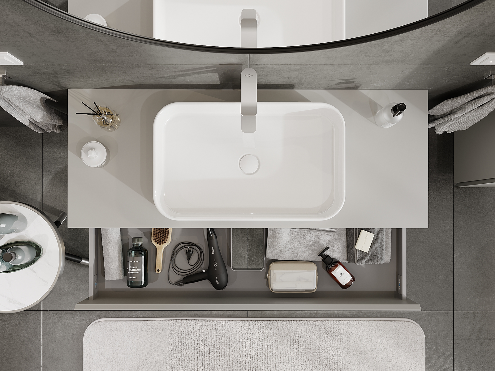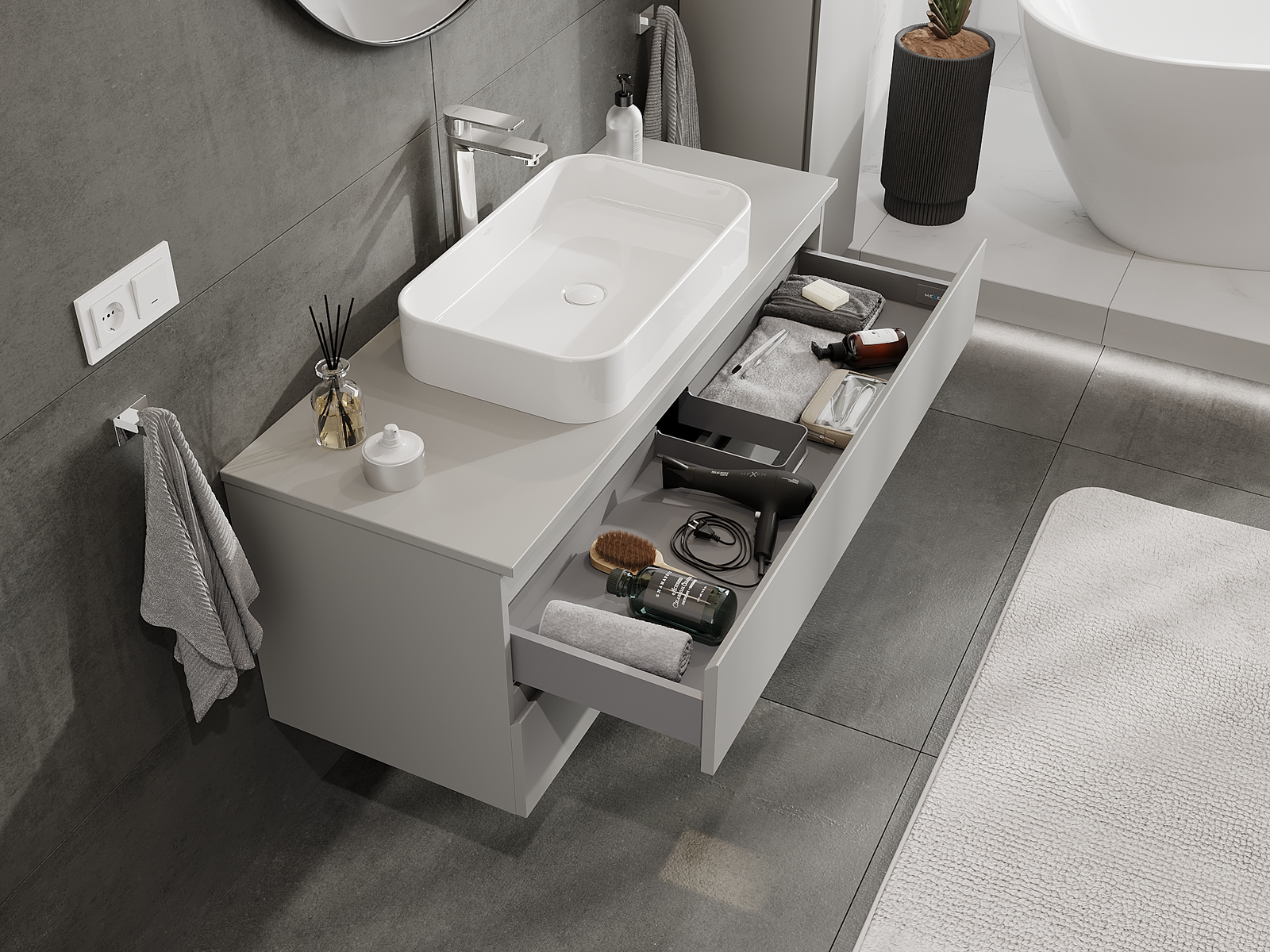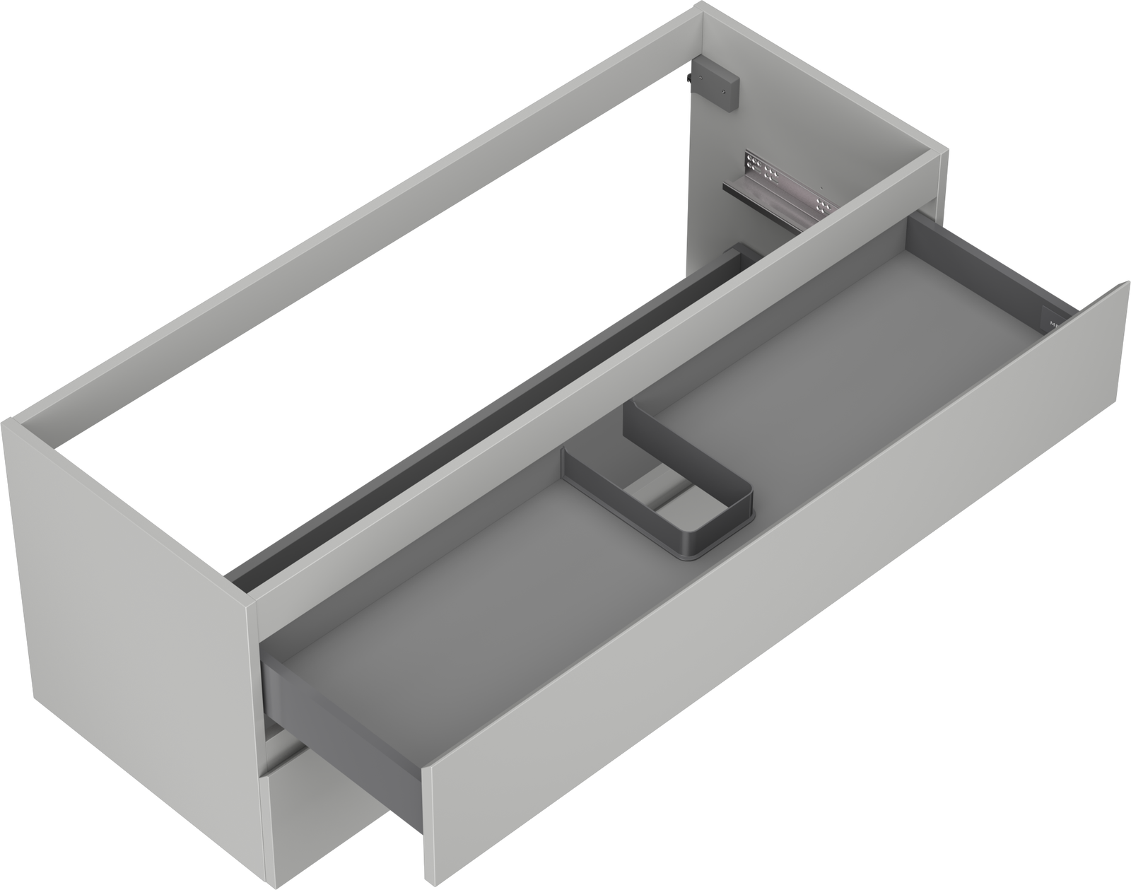 Výrez v zásuvke je navrhnutý tak, aby pojal sifón, ktorý je nevyhnutný v umývadlových inštaláciách. Vďaka tomu môže byť nábytok namontovaný plne funkčne, bez nutnosti vzdávať sa priestoru v zásuvke v prospech inštalácie.