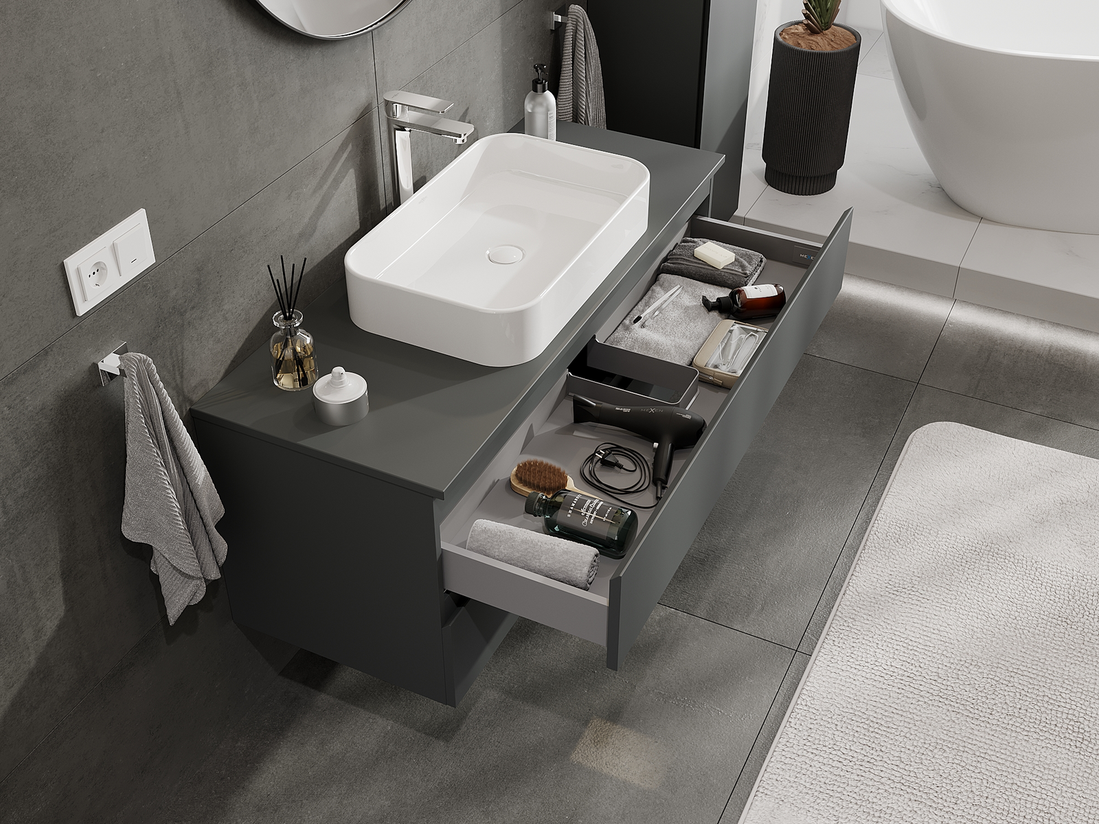 Výrez v zásuvke je navrhnutý tak, aby pojal sifón, ktorý je nevyhnutný v umývadlových inštaláciách. Vďaka tomu môže byť nábytok namontovaný plne funkčne, bez nutnosti vzdávať sa priestoru v zásuvke v prospech inštalácie.