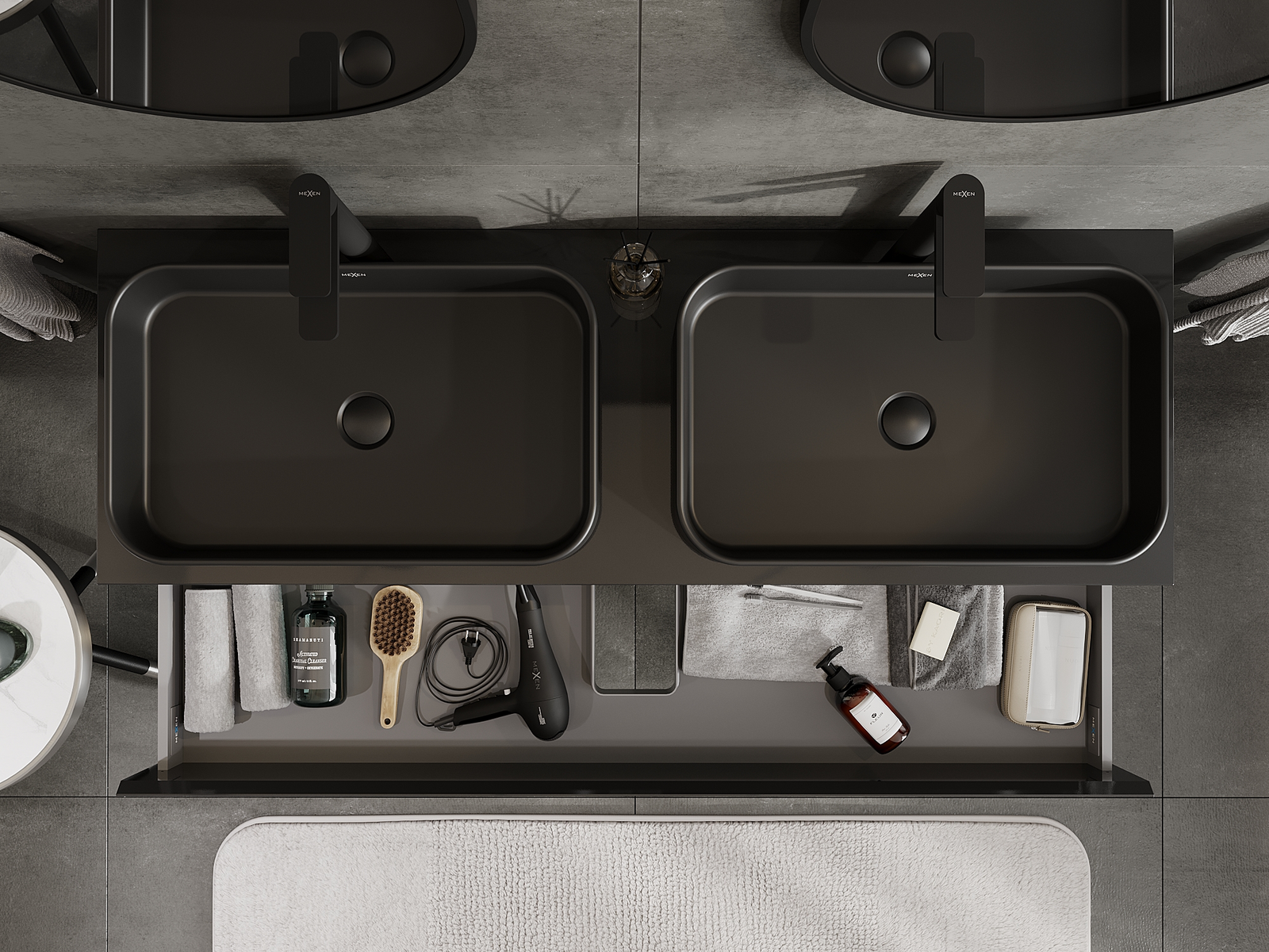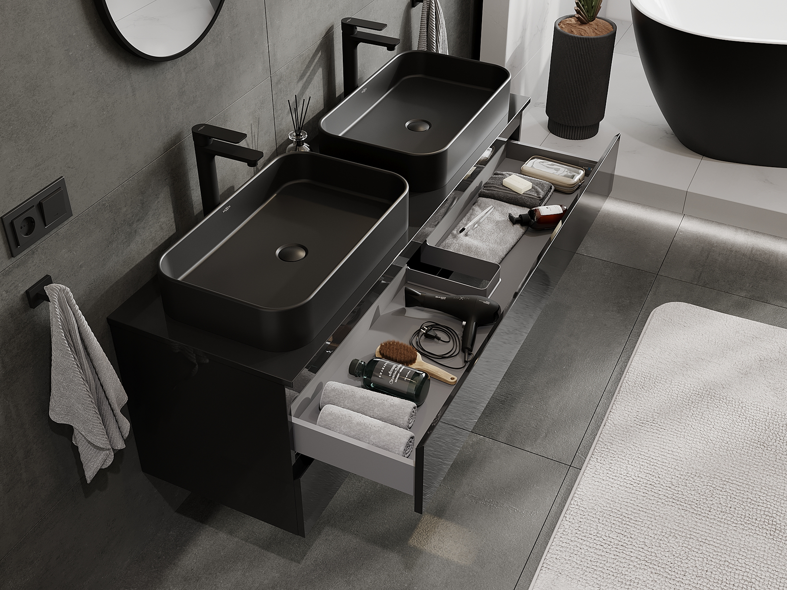 Výrez v zásuvke je navrhnutý tak, aby pojal sifón, ktorý je nevyhnutný v umývadlových inštaláciách. Vďaka tomu môže byť nábytok namontovaný plne funkčne, bez nutnosti vzdávať sa priestoru v zásuvke v prospech inštalácie.