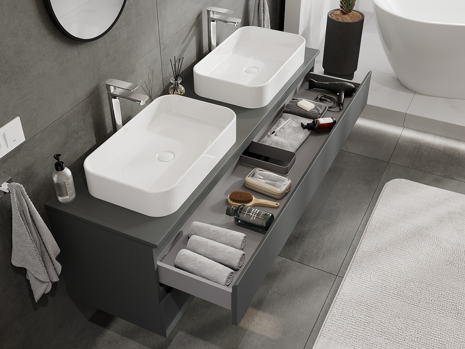 Výrez v zásuvke je navrhnutý tak, aby pojal sifón, ktorý je nevyhnutný v umývadlových inštaláciách. Vďaka tomu môže byť nábytok namontovaný plne funkčne, bez nutnosti vzdávať sa priestoru v zásuvke v prospech inštalácie.