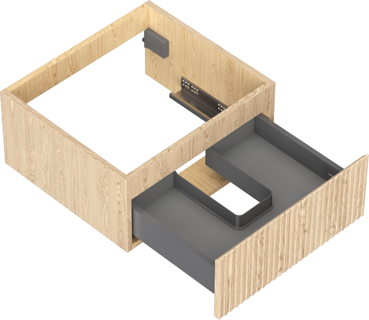 Výrez v zásuvke je navrhnutý tak, aby pojal sifón, ktorý je nevyhnutný v umývadlových inštaláciách. Vďaka tomu môže byť nábytok namontovaný plne funkčne, bez nutnosti vzdávať sa priestoru v zásuvke v prospech inštalácie.