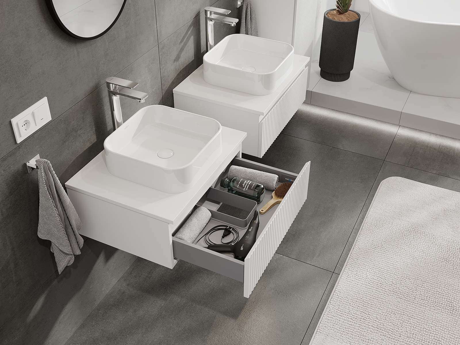 Naše modulárne kúpeľňové nábytkové prvky možno kombinovať v rôznych farebných konfiguráciách, čo umožňuje úplnú personalizáciu. Môžete si vybrať vzhľad aj funkcie jednotlivých prvkov, čo umožňuje prispôsobiť nábytok vašim vlastným štýlovým a používateľským preferenciám.