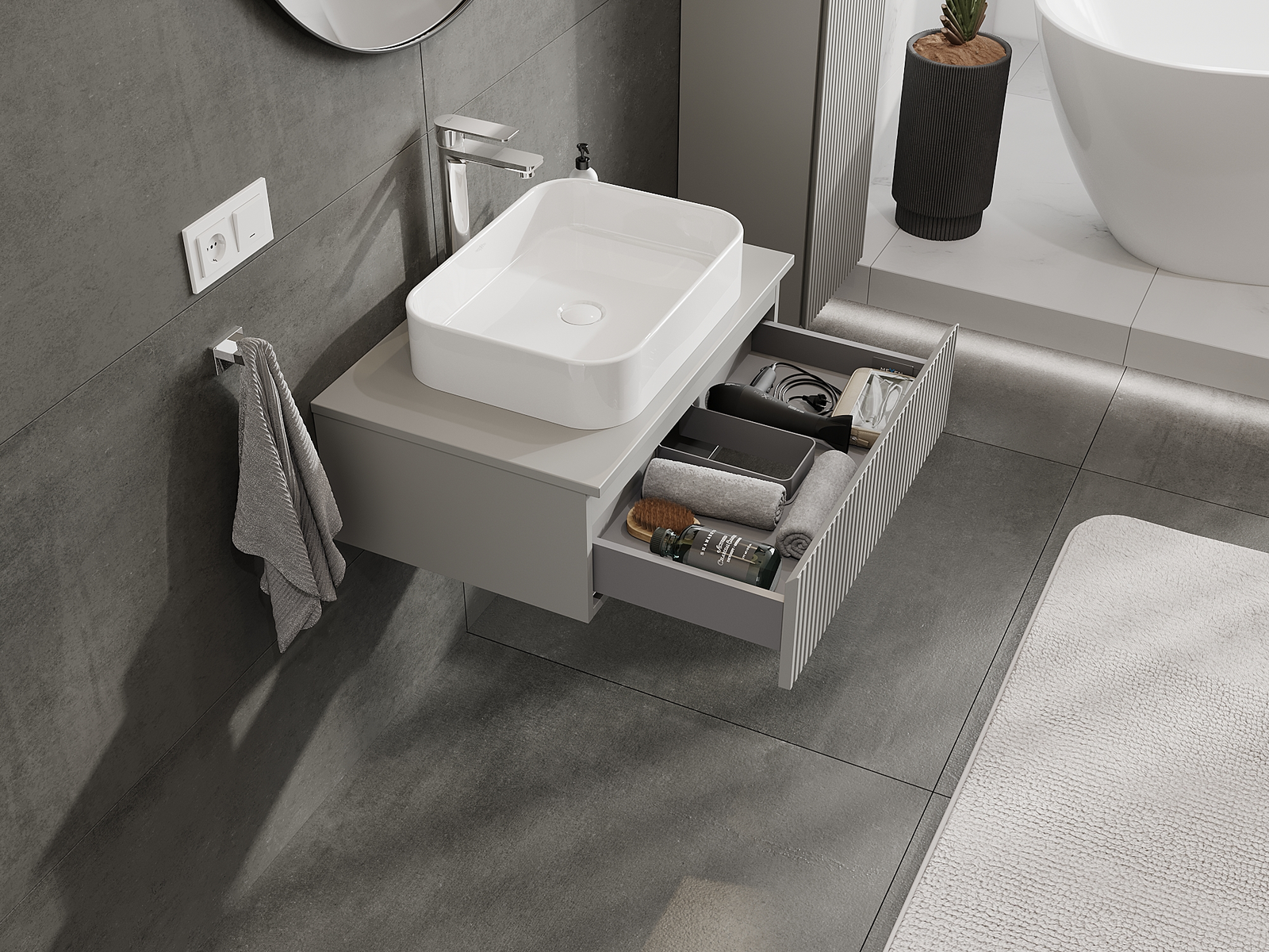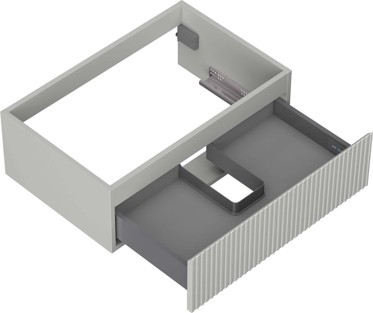 Výrez v zásuvke je navrhnutý tak, aby pojal sifón, ktorý je nevyhnutný v umývadlových inštaláciách. Vďaka tomu môže byť nábytok namontovaný plne funkčne, bez nutnosti vzdávať sa priestoru v zásuvke v prospech inštalácie.