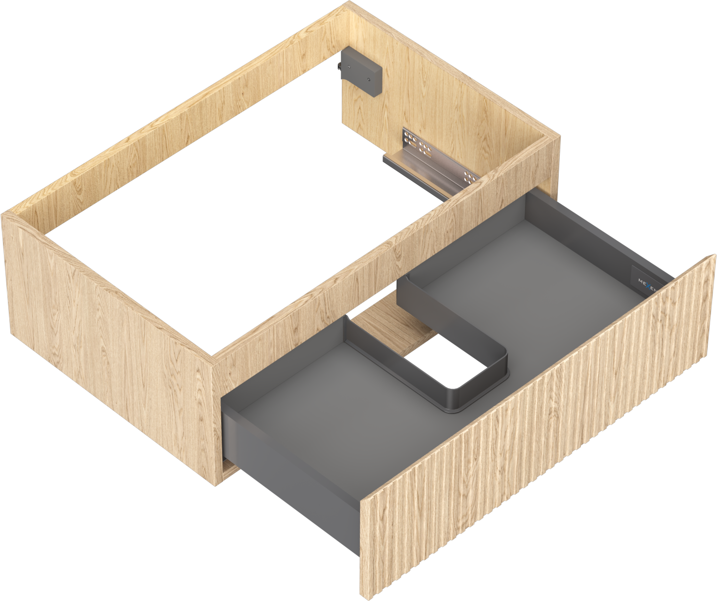 Výrez v zásuvke je navrhnutý tak, aby pojal sifón, ktorý je nevyhnutný v umývadlových inštaláciách. Vďaka tomu môže byť nábytok namontovaný plne funkčne, bez nutnosti vzdávať sa priestoru v zásuvke v prospech inštalácie.