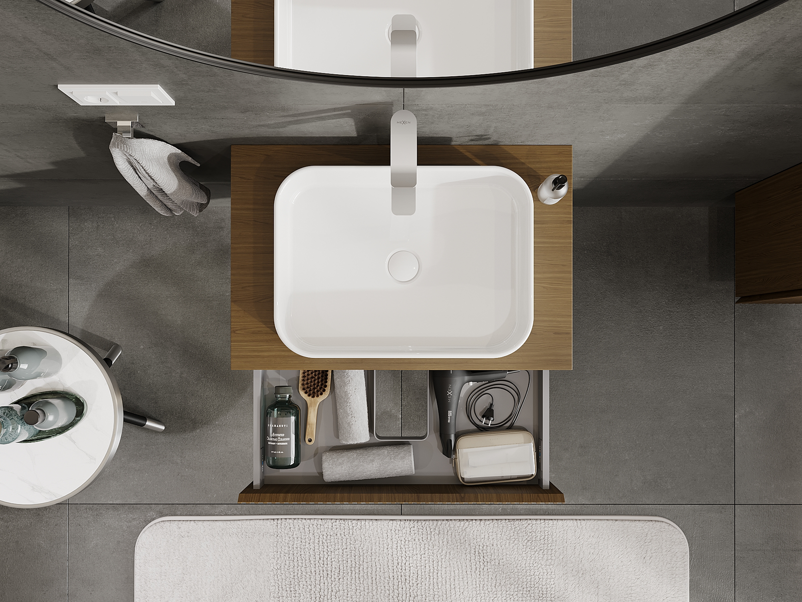 Výrez v zásuvke je navrhnutý tak, aby pojal sifón, ktorý je nevyhnutný v umývadlových inštaláciách. Vďaka tomu môže byť nábytok namontovaný plne funkčne, bez nutnosti vzdávať sa priestoru v zásuvke v prospech inštalácie.