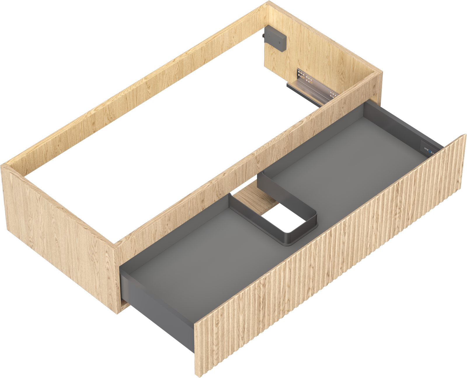 Výrez v zásuvke je navrhnutý tak, aby pojal sifón, ktorý je nevyhnutný v umývadlových inštaláciách. Vďaka tomu môže byť nábytok namontovaný plne funkčne, bez nutnosti vzdávať sa priestoru v zásuvke v prospech inštalácie.