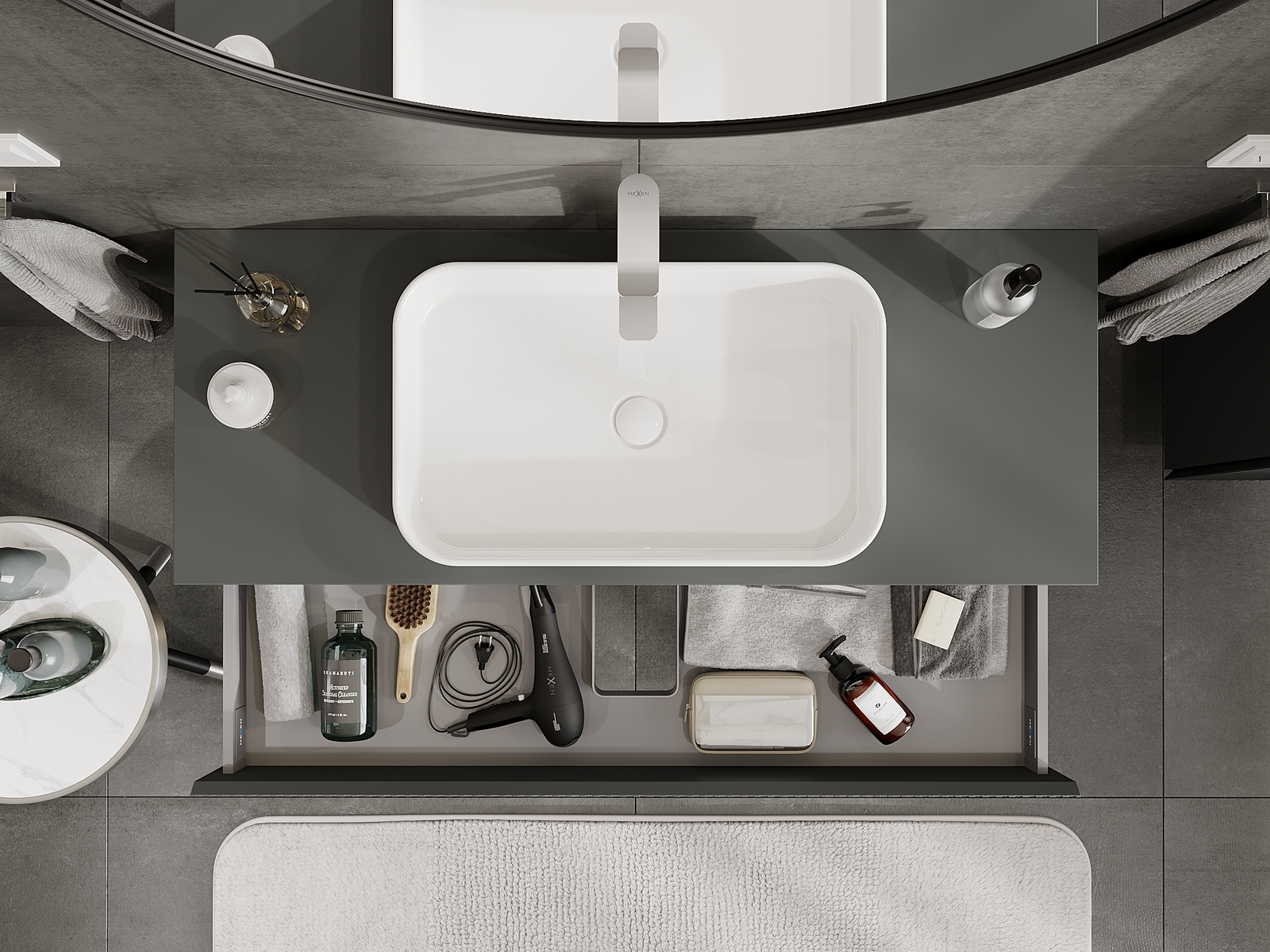 Výrez v zásuvke je navrhnutý tak, aby pojal sifón, ktorý je nevyhnutný v umývadlových inštaláciách. Vďaka tomu môže byť nábytok namontovaný plne funkčne, bez nutnosti vzdávať sa priestoru v zásuvke v prospech inštalácie.