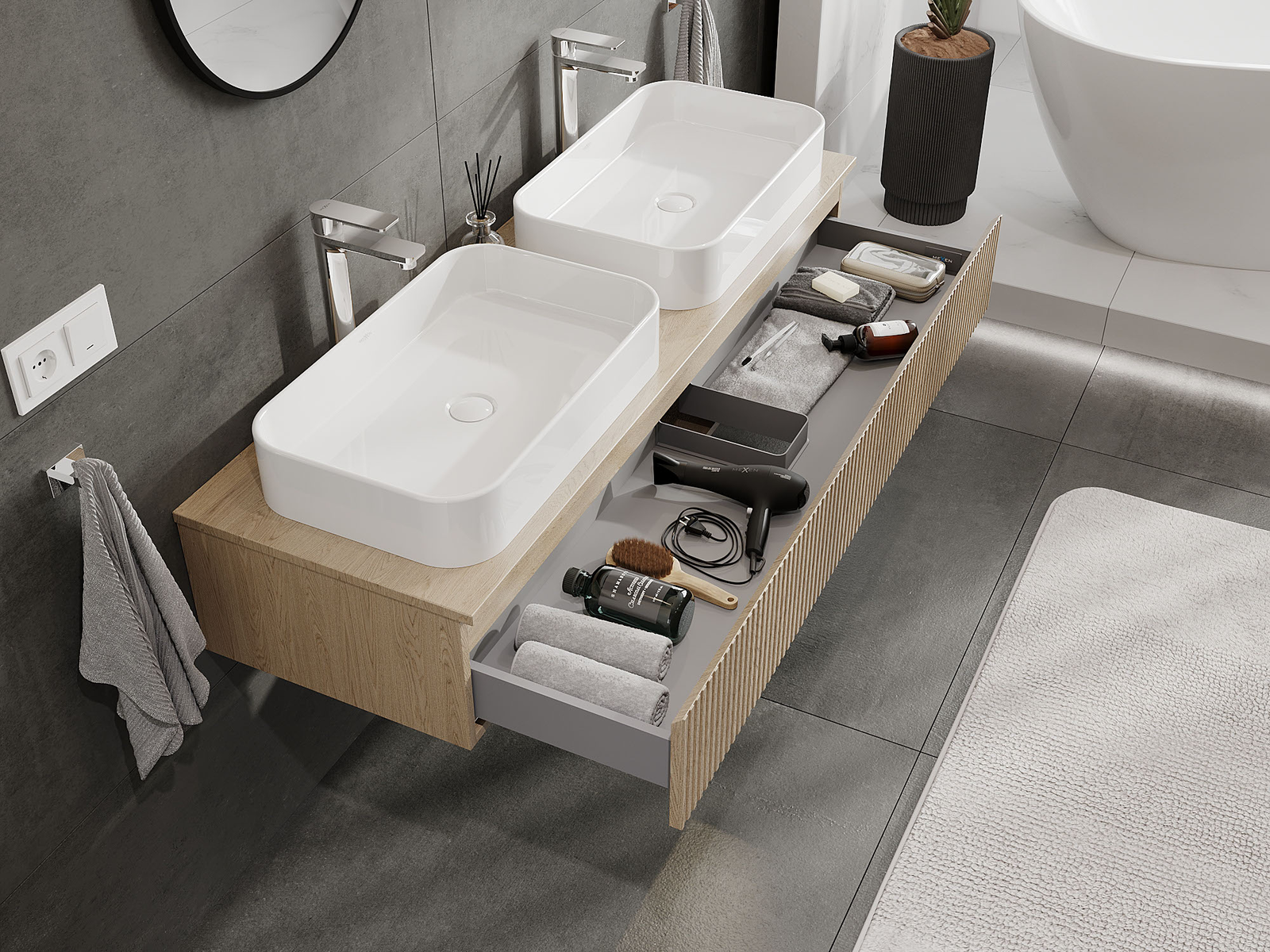 Výrez v zásuvke je navrhnutý tak, aby pojal sifón, ktorý je nevyhnutný v umývadlových inštaláciách. Vďaka tomu môže byť nábytok namontovaný plne funkčne, bez nutnosti vzdávať sa priestoru v zásuvke v prospech inštalácie.
