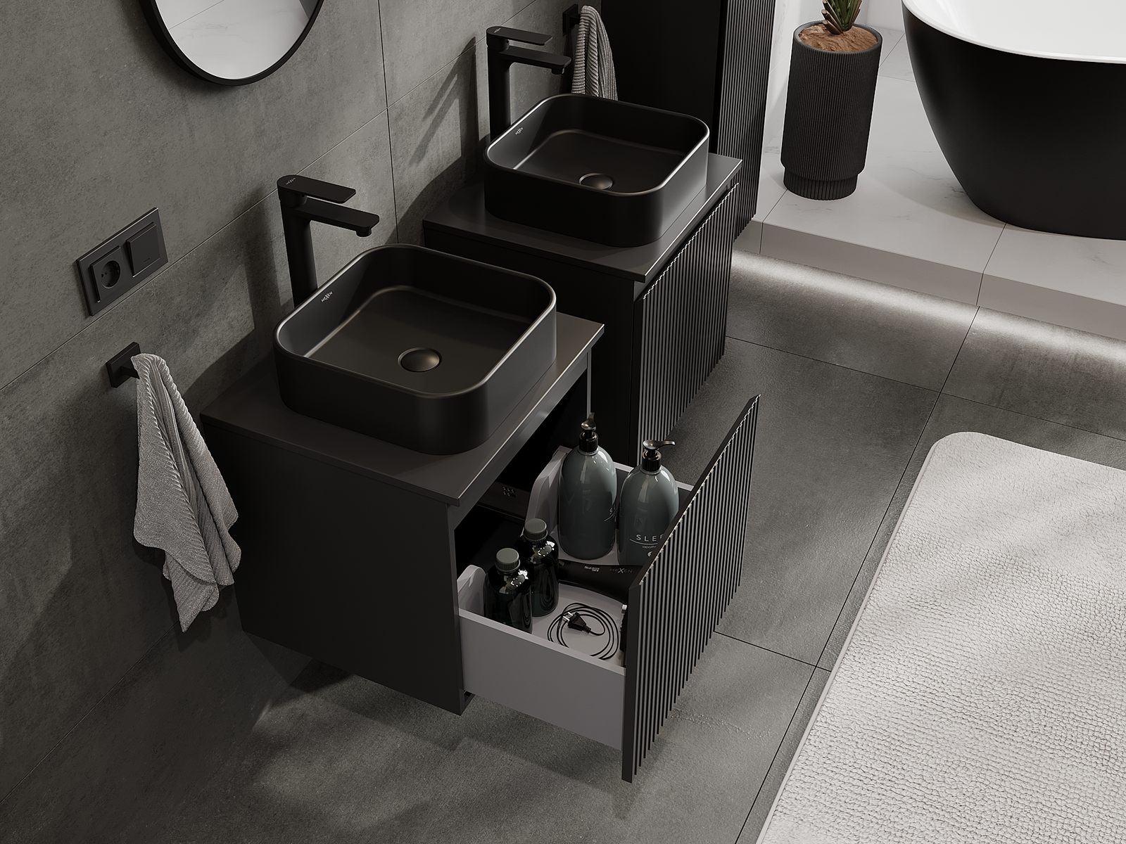 Výrez v zásuvke je navrhnutý tak, aby pojal sifón, ktorý je nevyhnutný v umývadlových inštaláciách. Vďaka tomu môže byť nábytok namontovaný plne funkčne, bez nutnosti vzdávať sa priestoru v zásuvke v prospech inštalácie.