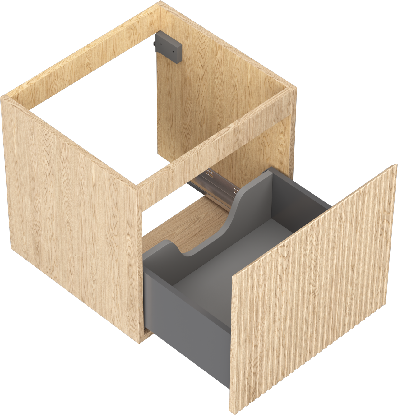 Výrez v zásuvke je navrhnutý tak, aby pojal sifón, ktorý je nevyhnutný v umývadlových inštaláciách. Vďaka tomu môže byť nábytok namontovaný plne funkčne, bez nutnosti vzdávať sa priestoru v zásuvke v prospech inštalácie.
