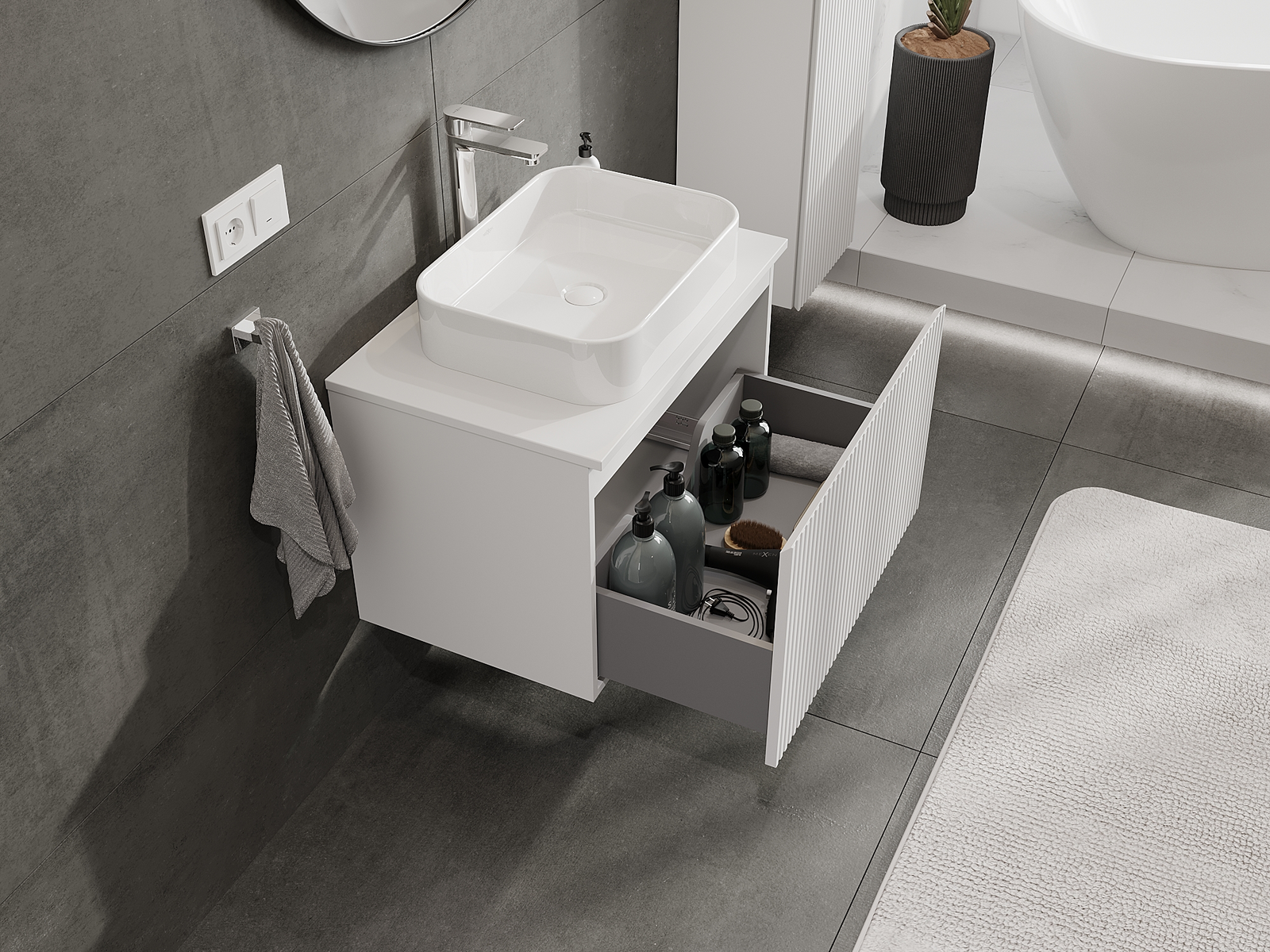 Výrez v zásuvke je navrhnutý tak, aby pojal sifón, ktorý je nevyhnutný v umývadlových inštaláciách. Vďaka tomu môže byť nábytok namontovaný plne funkčne, bez nutnosti vzdávať sa priestoru v zásuvke v prospech inštalácie.