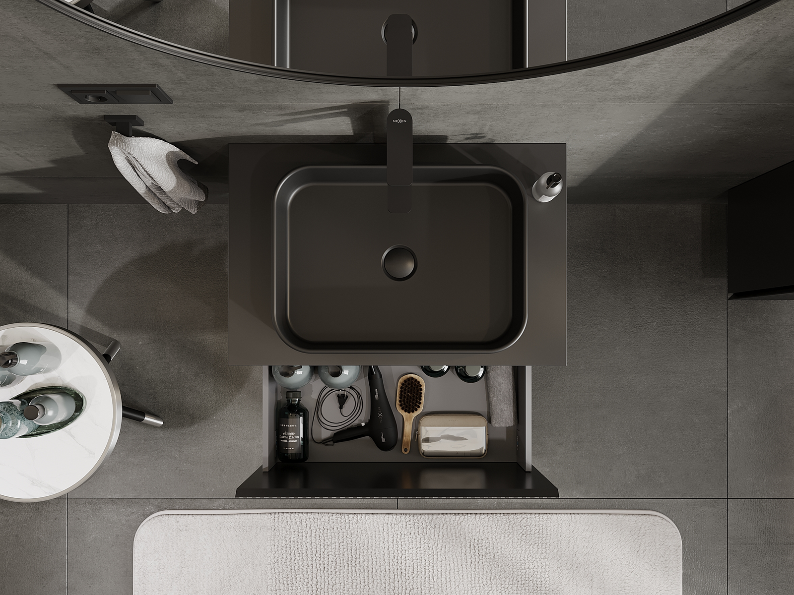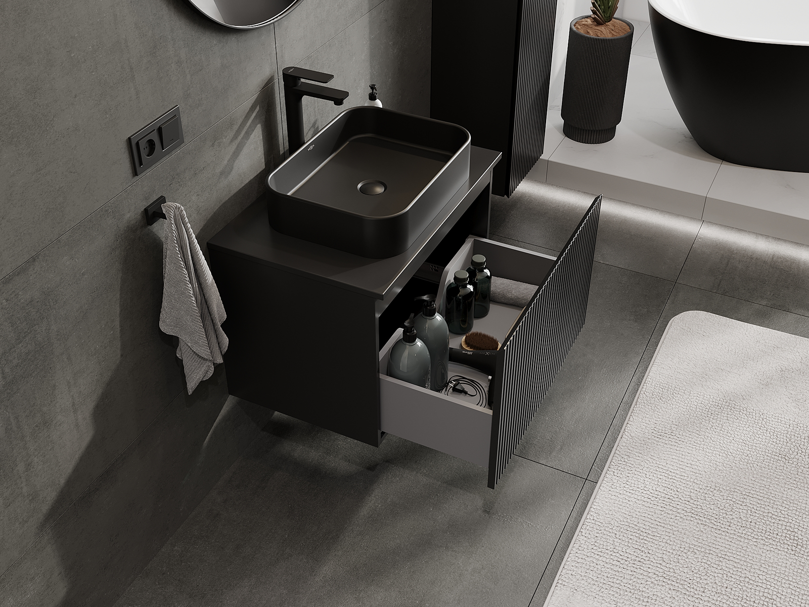 Výrez v zásuvke je navrhnutý tak, aby pojal sifón, ktorý je nevyhnutný v umývadlových inštaláciách. Vďaka tomu môže byť nábytok namontovaný plne funkčne, bez nutnosti vzdávať sa priestoru v zásuvke v prospech inštalácie.
