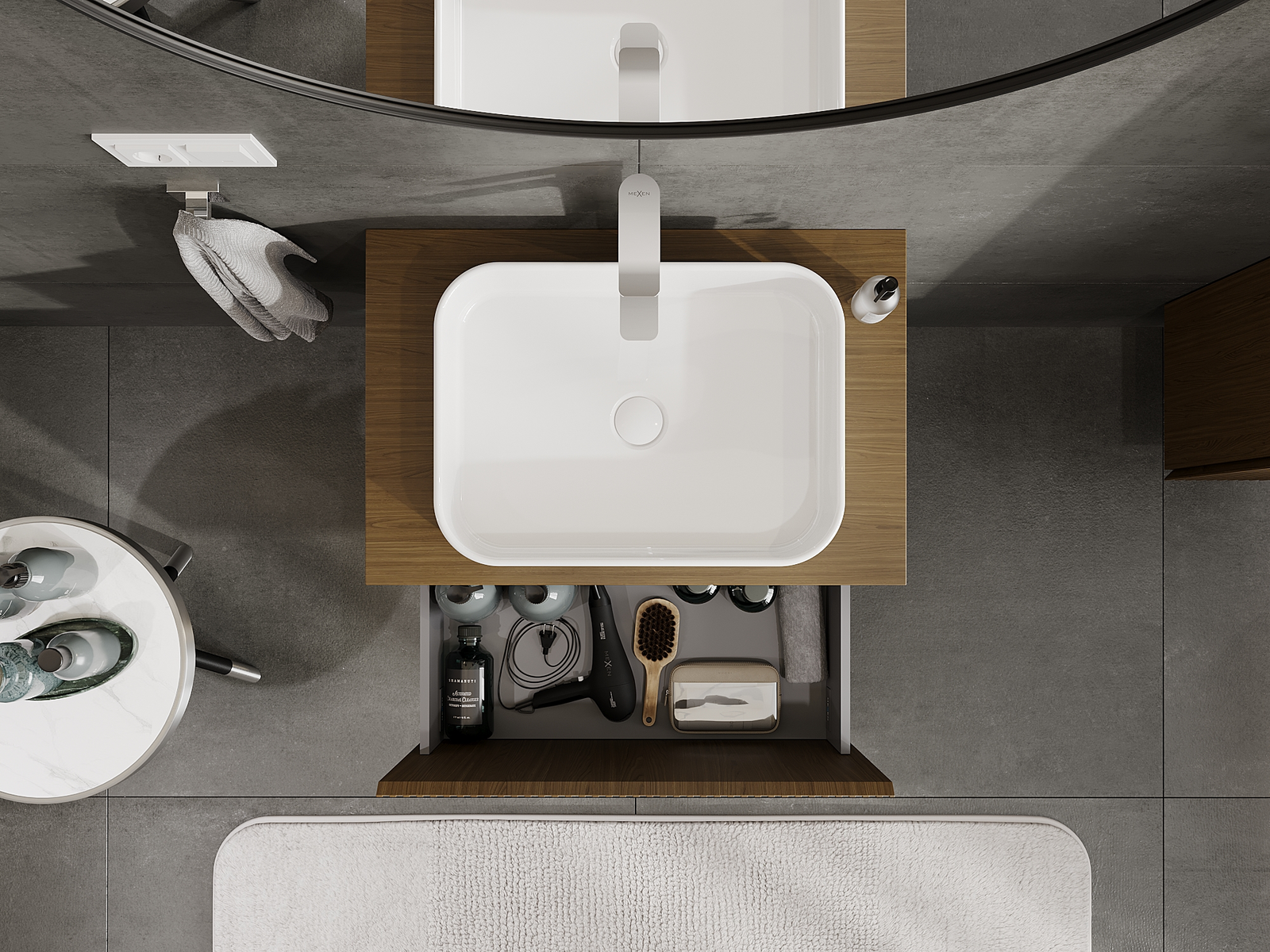Výrez v zásuvke je navrhnutý tak, aby pojal sifón, ktorý je nevyhnutný v umývadlových inštaláciách. Vďaka tomu môže byť nábytok namontovaný plne funkčne, bez nutnosti vzdávať sa priestoru v zásuvke v prospech inštalácie.