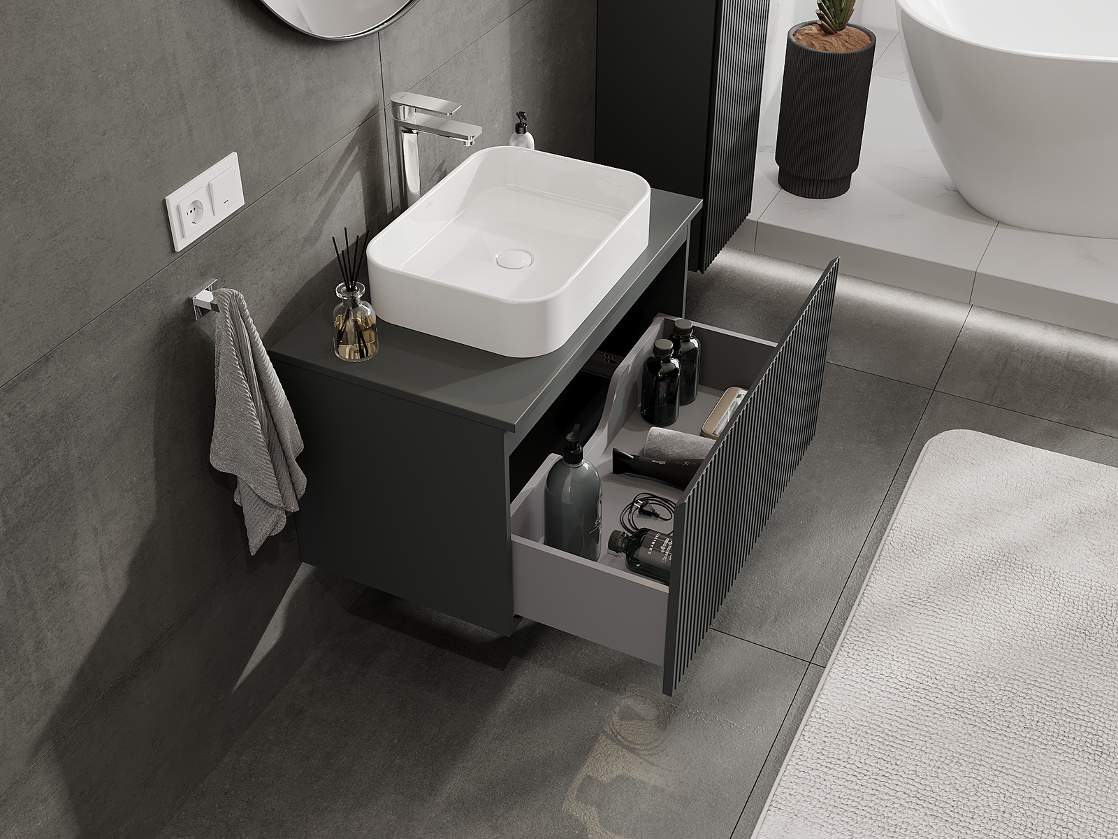 Výrez v zásuvke je navrhnutý tak, aby pojal sifón, ktorý je nevyhnutný v umývadlových inštaláciách. Vďaka tomu môže byť nábytok namontovaný plne funkčne, bez nutnosti vzdávať sa priestoru v zásuvke v prospech inštalácie.