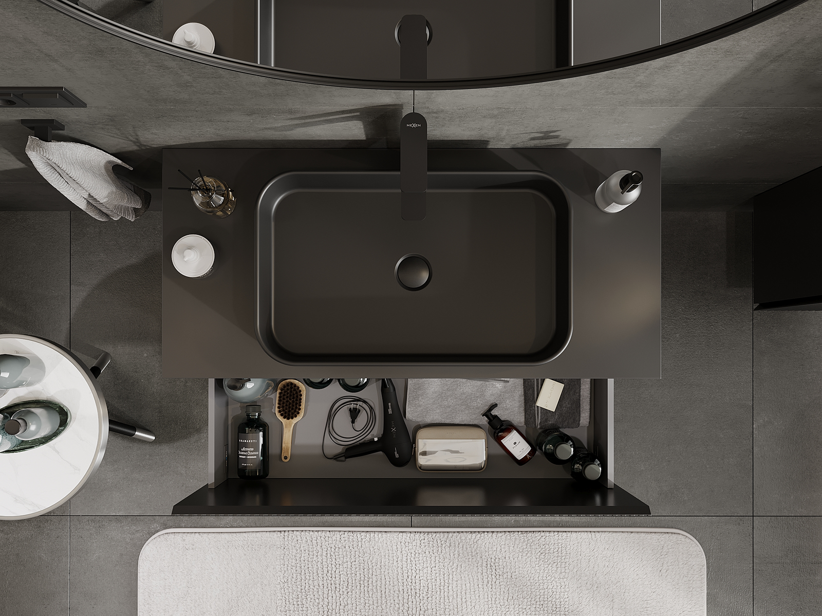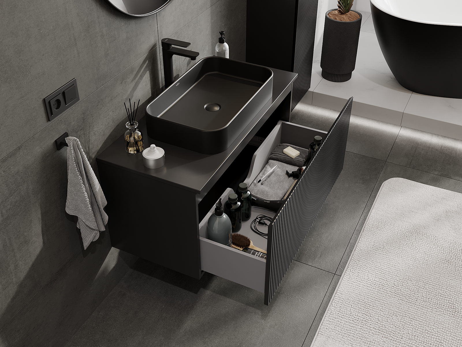 Výrez v zásuvke je navrhnutý tak, aby pojal sifón, ktorý je nevyhnutný v umývadlových inštaláciách. Vďaka tomu môže byť nábytok namontovaný plne funkčne, bez nutnosti vzdávať sa priestoru v zásuvke v prospech inštalácie.