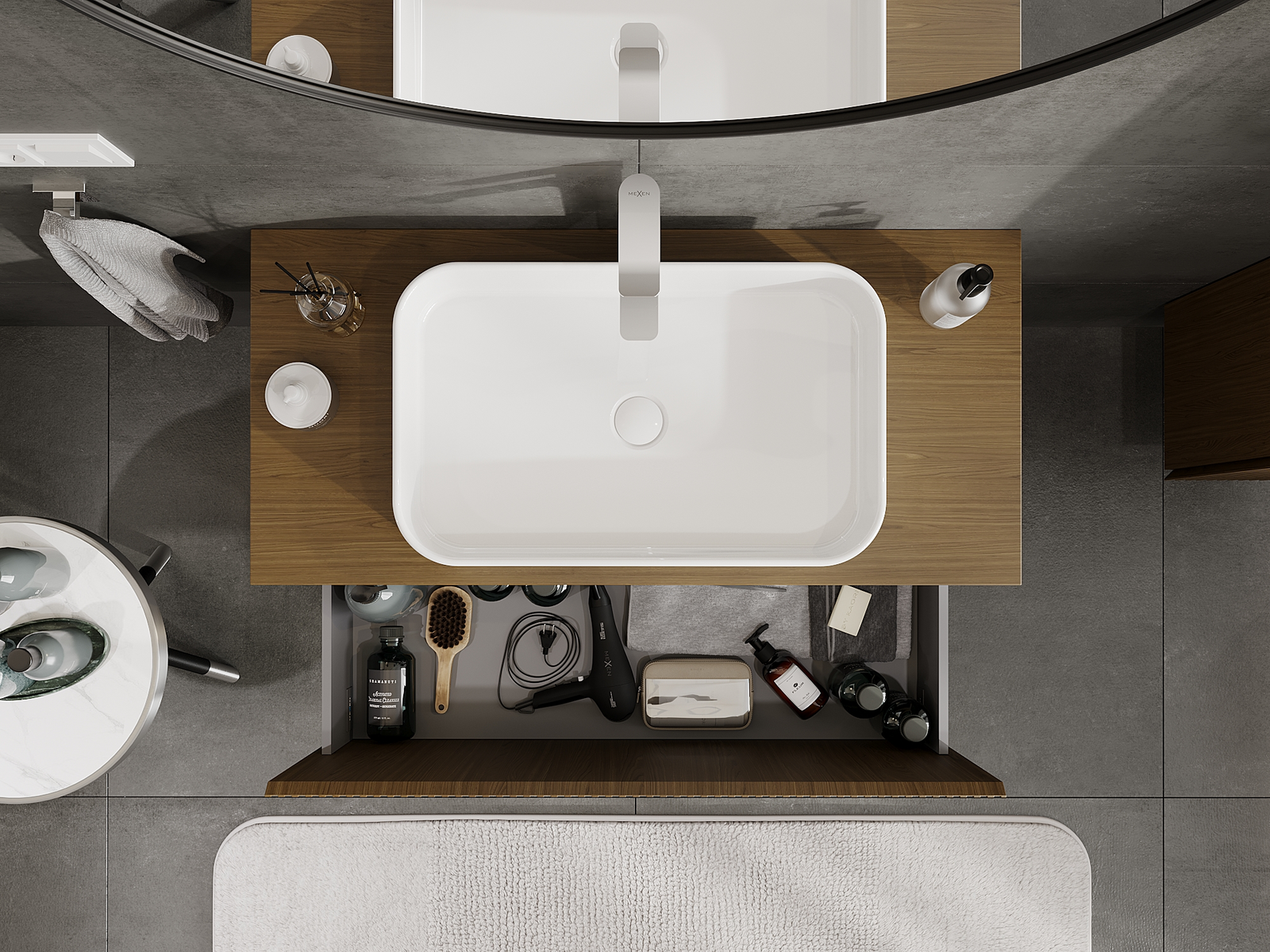 Výrez v zásuvke je navrhnutý tak, aby pojal sifón, ktorý je nevyhnutný v umývadlových inštaláciách. Vďaka tomu môže byť nábytok namontovaný plne funkčne, bez nutnosti vzdávať sa priestoru v zásuvke v prospech inštalácie.