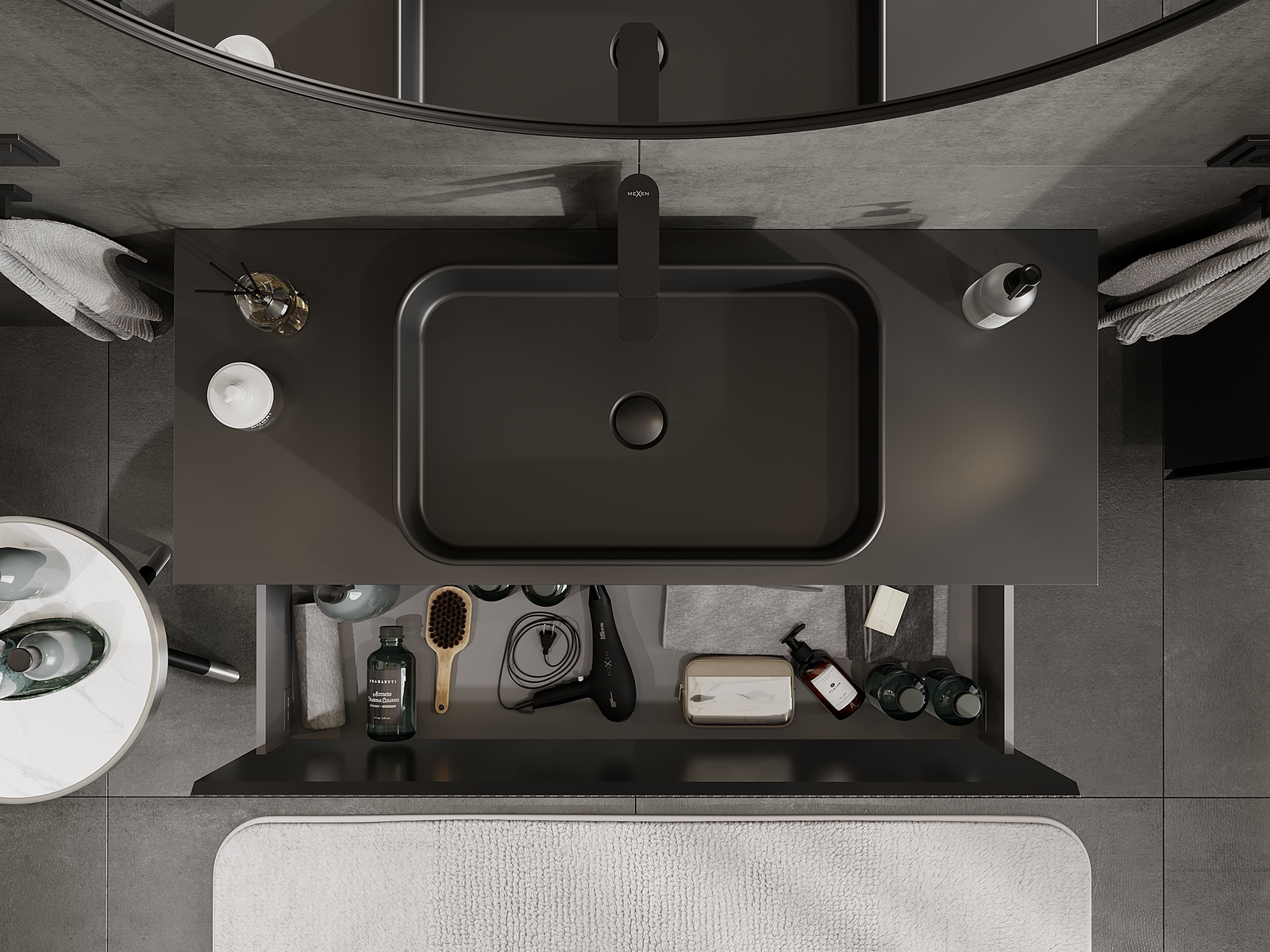 Výrez v zásuvke je navrhnutý tak, aby pojal sifón, ktorý je nevyhnutný v umývadlových inštaláciách. Vďaka tomu môže byť nábytok namontovaný plne funkčne, bez nutnosti vzdávať sa priestoru v zásuvke v prospech inštalácie.