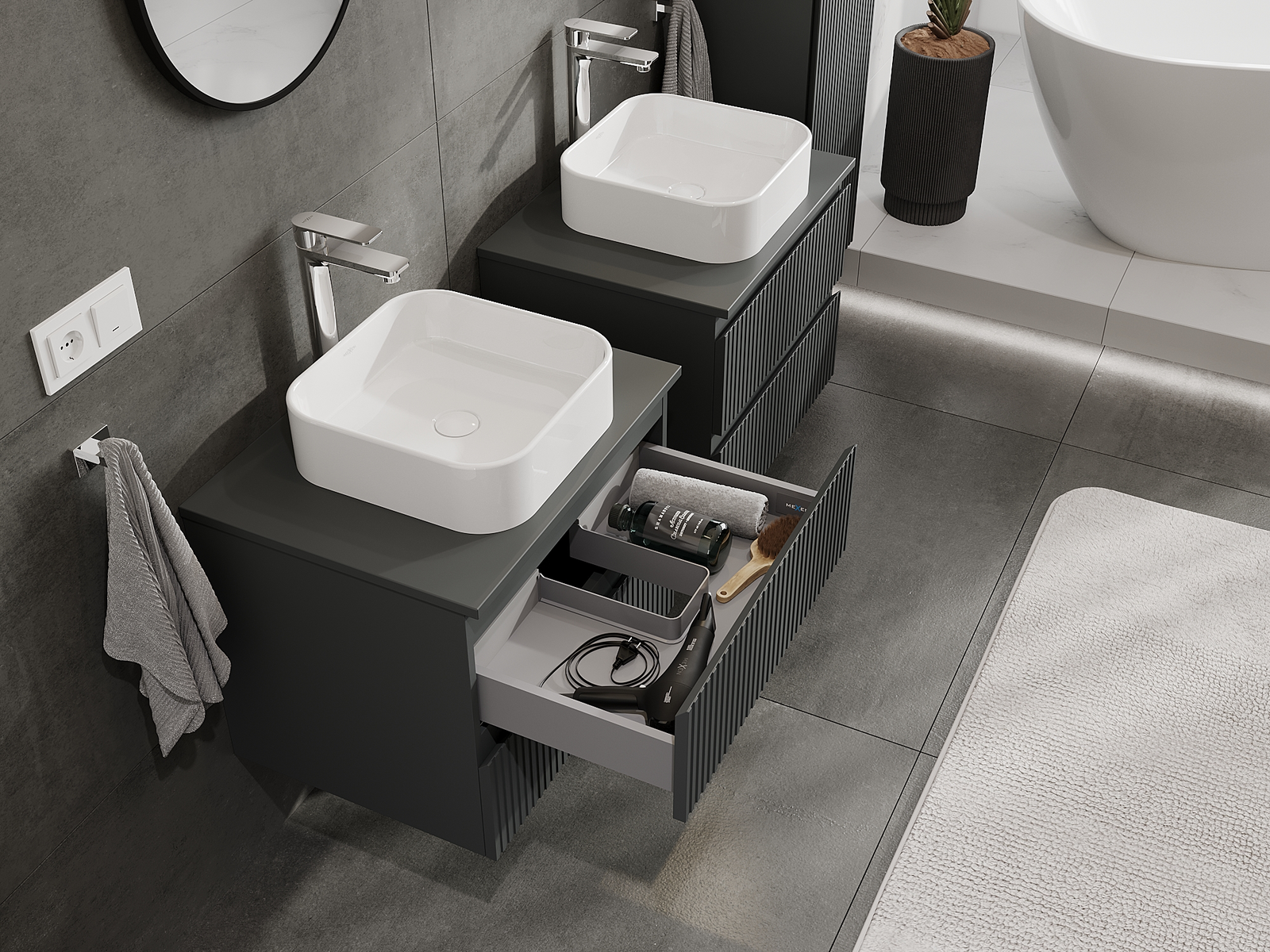 Výrez v zásuvke je navrhnutý tak, aby pojal sifón, ktorý je nevyhnutný v umývadlových inštaláciách. Vďaka tomu môže byť nábytok namontovaný plne funkčne, bez nutnosti vzdávať sa priestoru v zásuvke v prospech inštalácie.