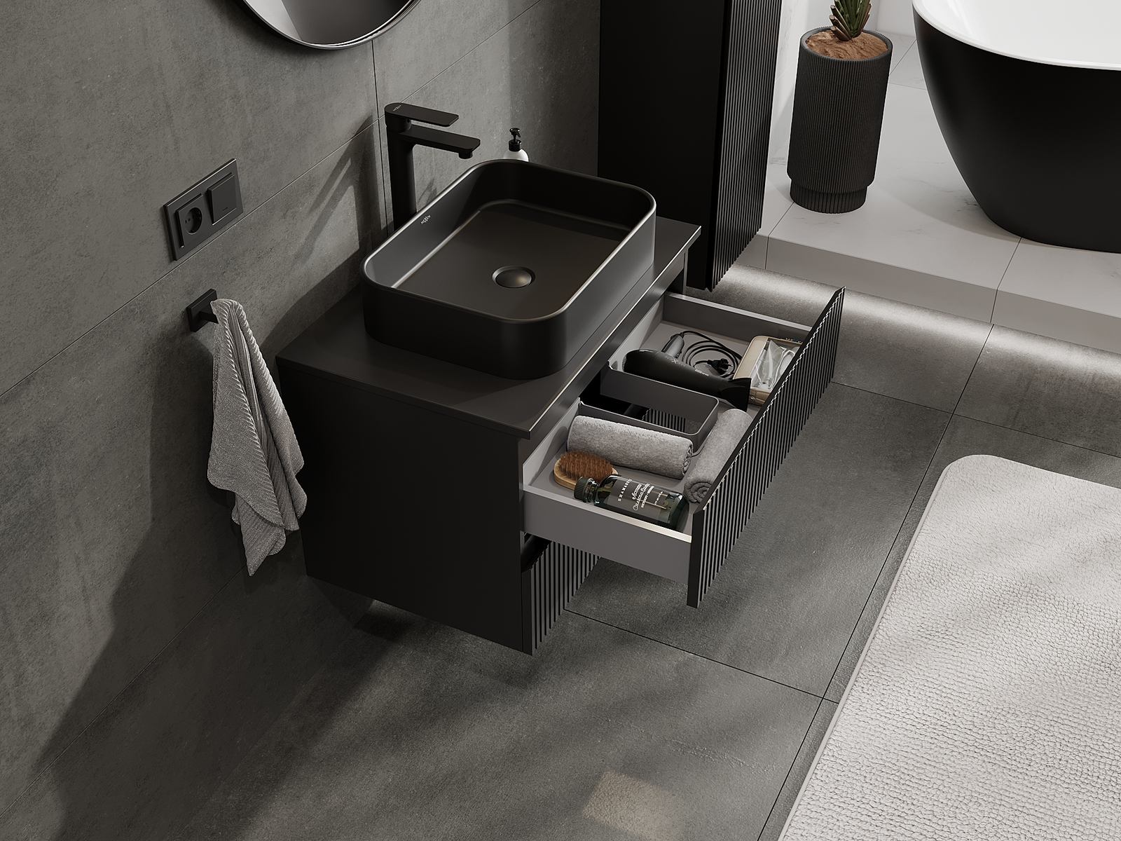Výrez v zásuvke je navrhnutý tak, aby pojal sifón, ktorý je nevyhnutný v umývadlových inštaláciách. Vďaka tomu môže byť nábytok namontovaný plne funkčne, bez nutnosti vzdávať sa priestoru v zásuvke v prospech inštalácie.