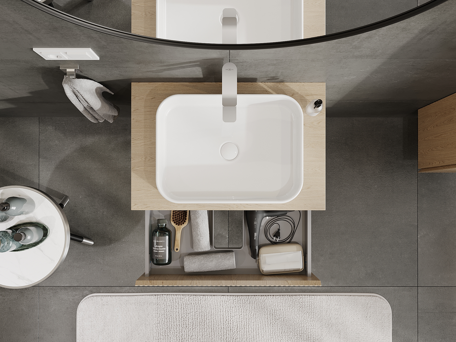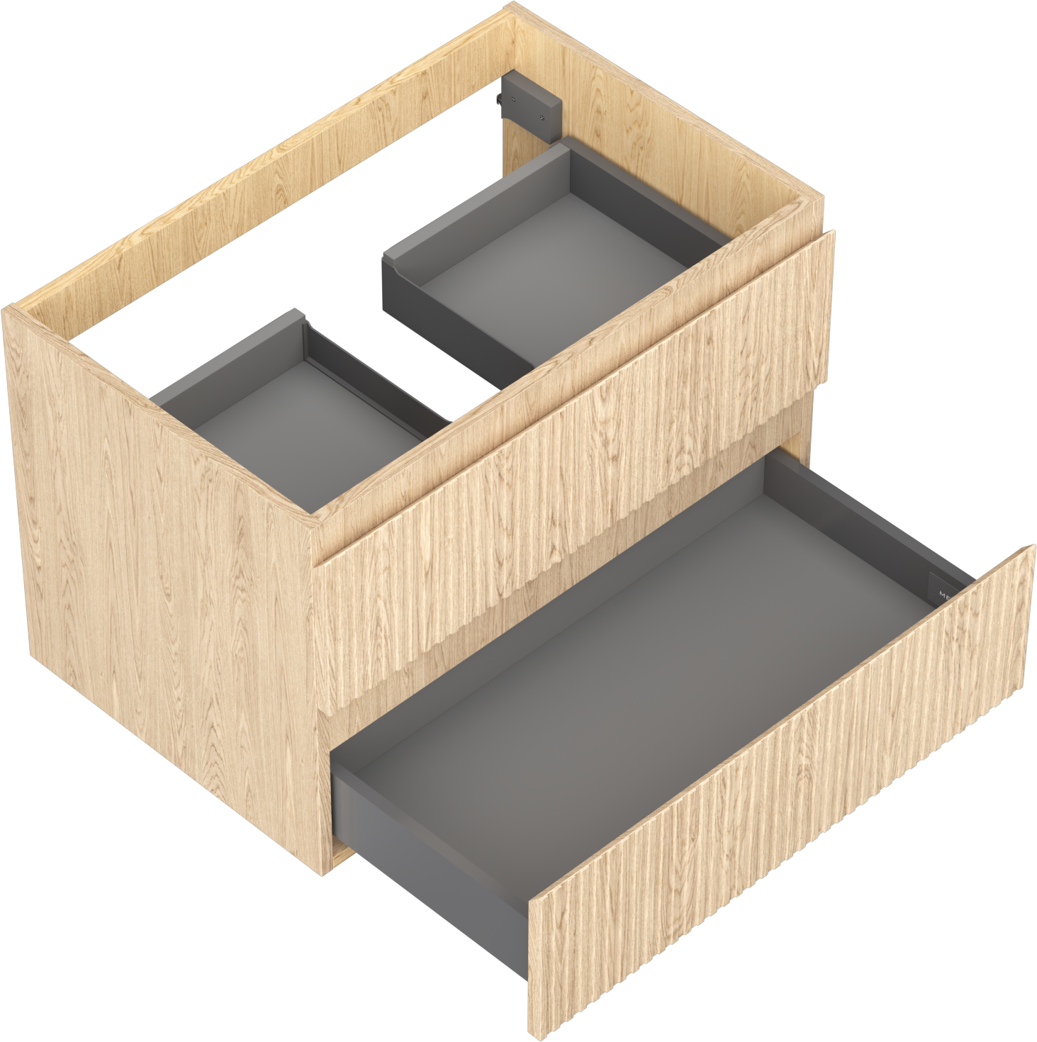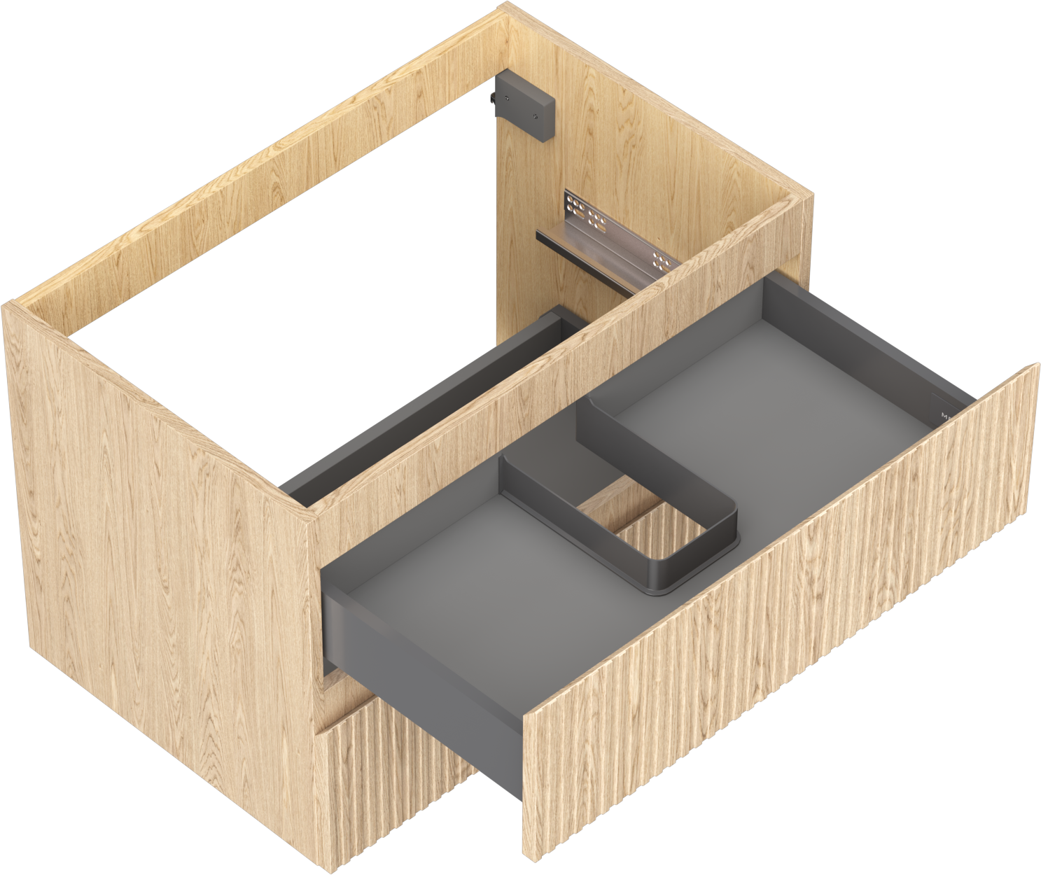 Výrez v zásuvke je navrhnutý tak, aby pojal sifón, ktorý je nevyhnutný v umývadlových inštaláciách. Vďaka tomu môže byť nábytok namontovaný plne funkčne, bez nutnosti vzdávať sa priestoru v zásuvke v prospech inštalácie.
