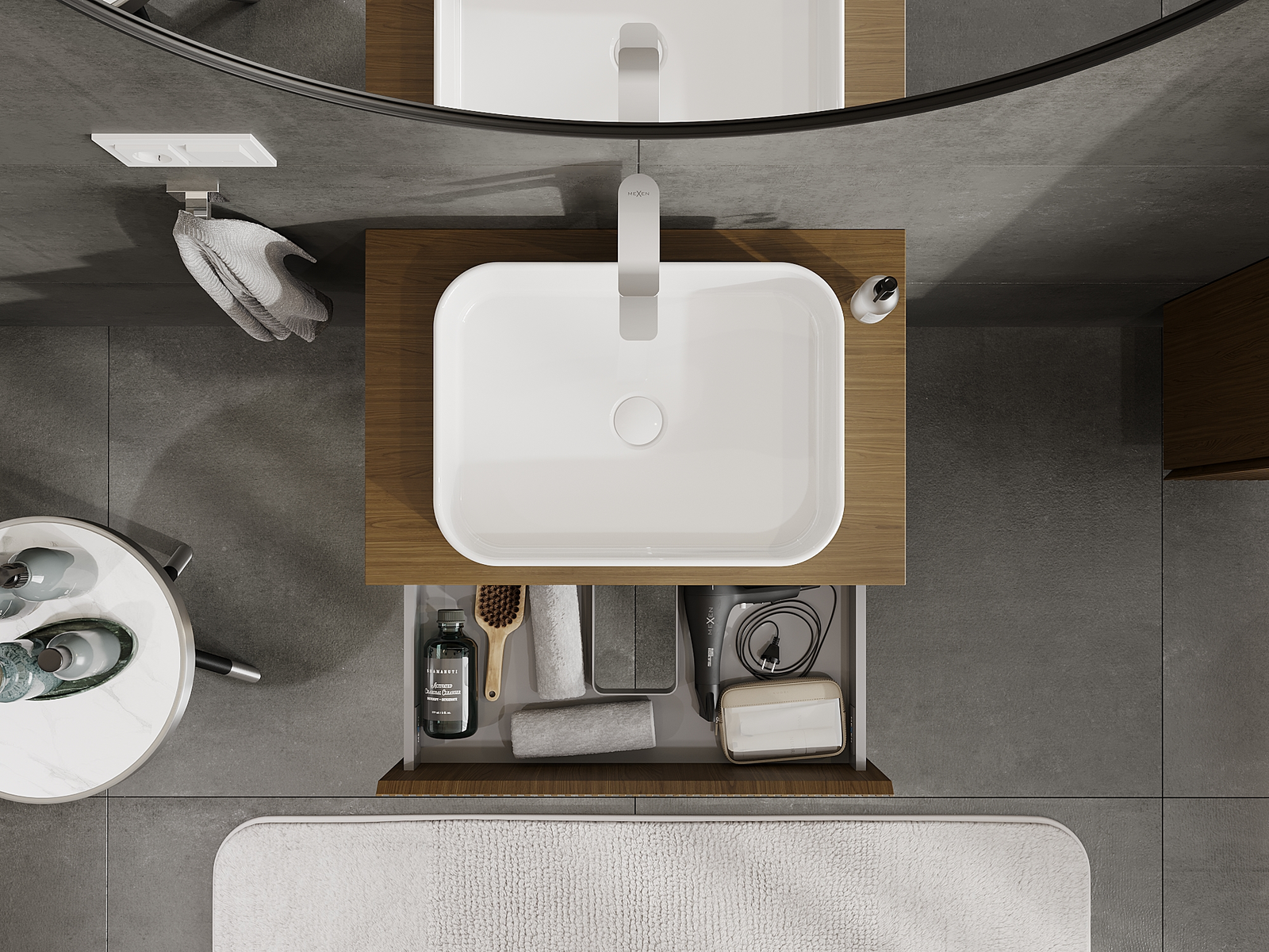 Výrez v zásuvke je navrhnutý tak, aby pojal sifón, ktorý je nevyhnutný v umývadlových inštaláciách. Vďaka tomu môže byť nábytok namontovaný plne funkčne, bez nutnosti vzdávať sa priestoru v zásuvke v prospech inštalácie.