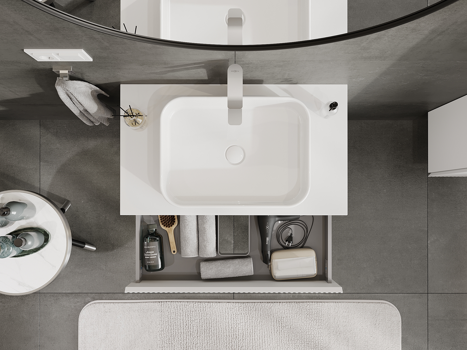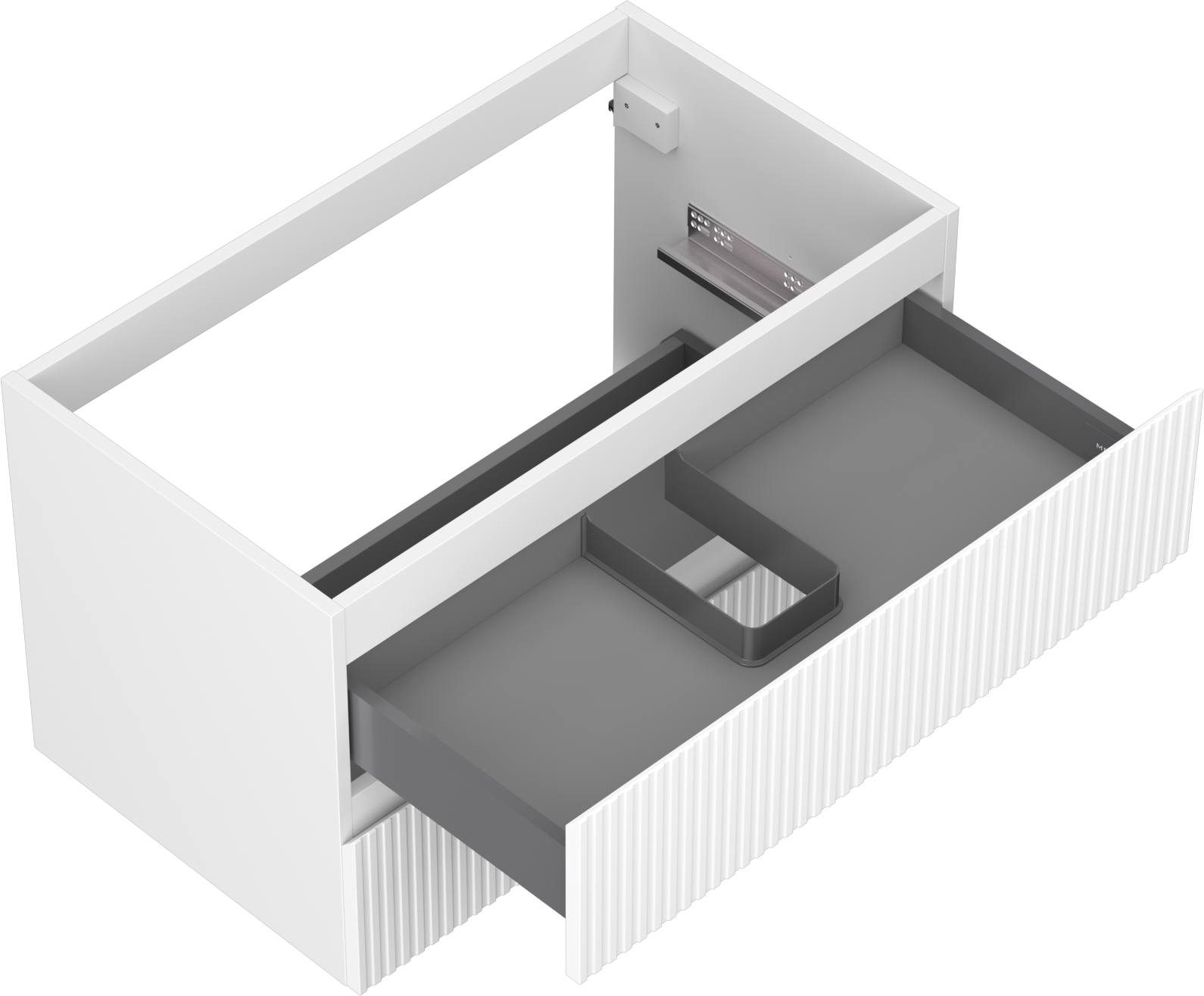 Výrez v zásuvke je navrhnutý tak, aby pojal sifón, ktorý je nevyhnutný v umývadlových inštaláciách. Vďaka tomu môže byť nábytok namontovaný plne funkčne, bez nutnosti vzdávať sa priestoru v zásuvke v prospech inštalácie.