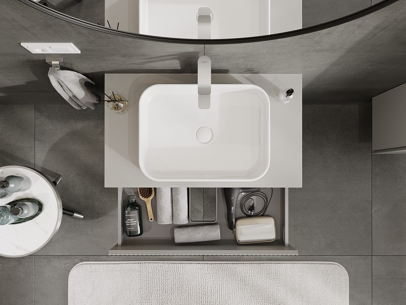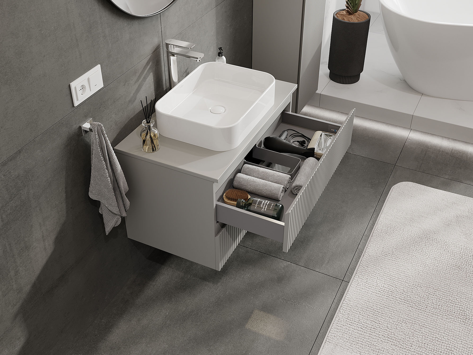 Výrez v zásuvke je navrhnutý tak, aby pojal sifón, ktorý je nevyhnutný v umývadlových inštaláciách. Vďaka tomu môže byť nábytok namontovaný plne funkčne, bez nutnosti vzdávať sa priestoru v zásuvke v prospech inštalácie.