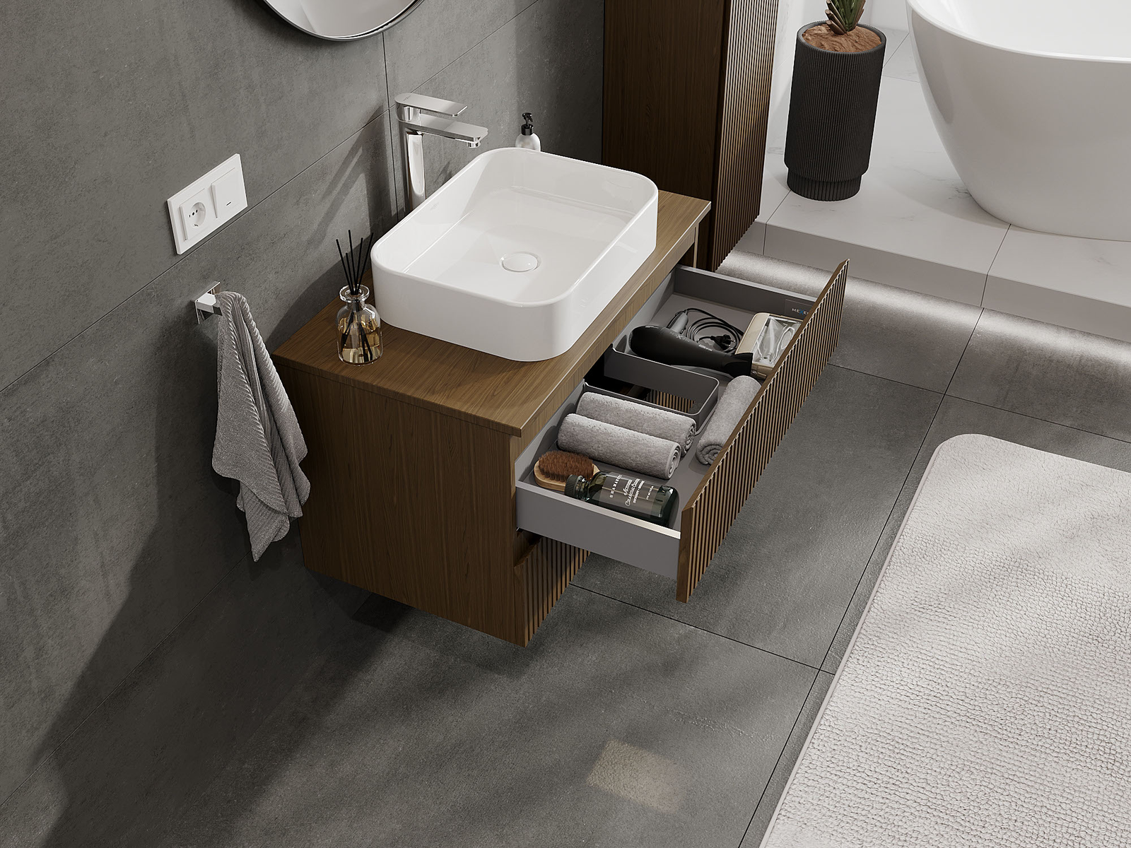 Výrez v zásuvke je navrhnutý tak, aby pojal sifón, ktorý je nevyhnutný v umývadlových inštaláciách. Vďaka tomu môže byť nábytok namontovaný plne funkčne, bez nutnosti vzdávať sa priestoru v zásuvke v prospech inštalácie.
