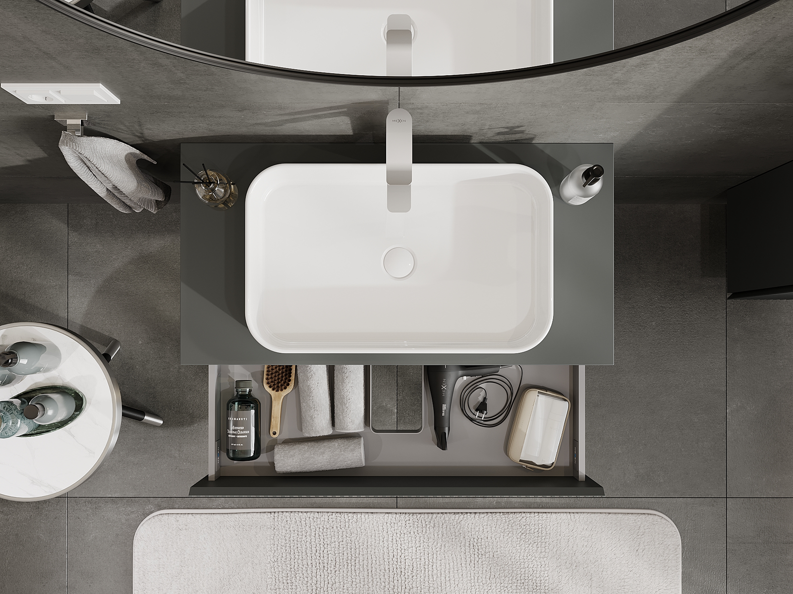 Výrez v zásuvke je navrhnutý tak, aby pojal sifón, ktorý je nevyhnutný v umývadlových inštaláciách. Vďaka tomu môže byť nábytok namontovaný plne funkčne, bez nutnosti vzdávať sa priestoru v zásuvke v prospech inštalácie.