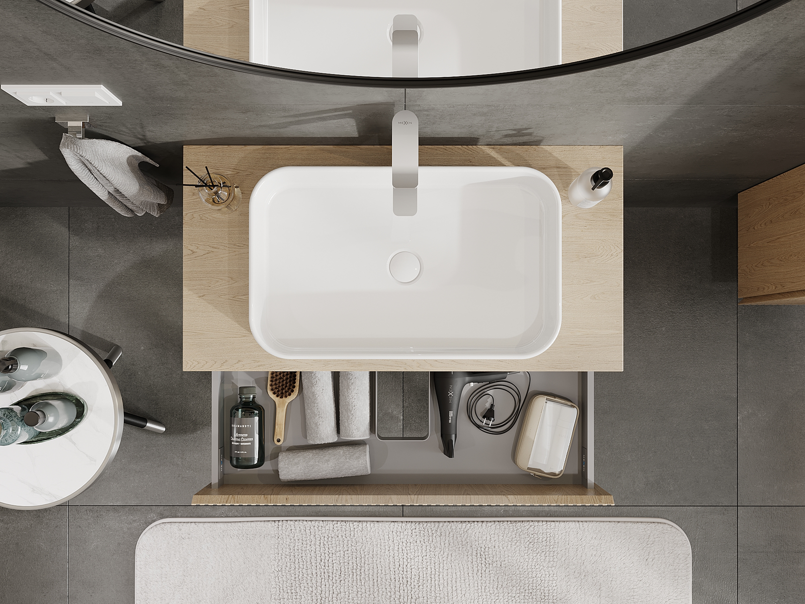 Výrez v zásuvke je navrhnutý tak, aby pojal sifón, ktorý je nevyhnutný v umývadlových inštaláciách. Vďaka tomu môže byť nábytok namontovaný plne funkčne, bez nutnosti vzdávať sa priestoru v zásuvke v prospech inštalácie.