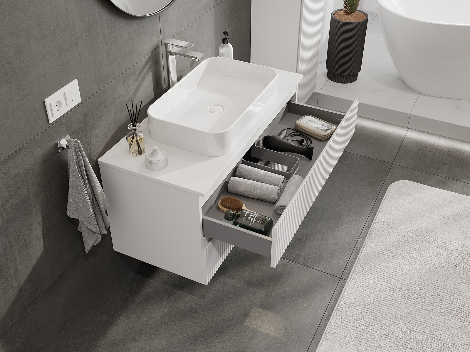 Výrez v zásuvke je navrhnutý tak, aby pojal sifón, ktorý je nevyhnutný v umývadlových inštaláciách. Vďaka tomu môže byť nábytok namontovaný plne funkčne, bez nutnosti vzdávať sa priestoru v zásuvke v prospech inštalácie.