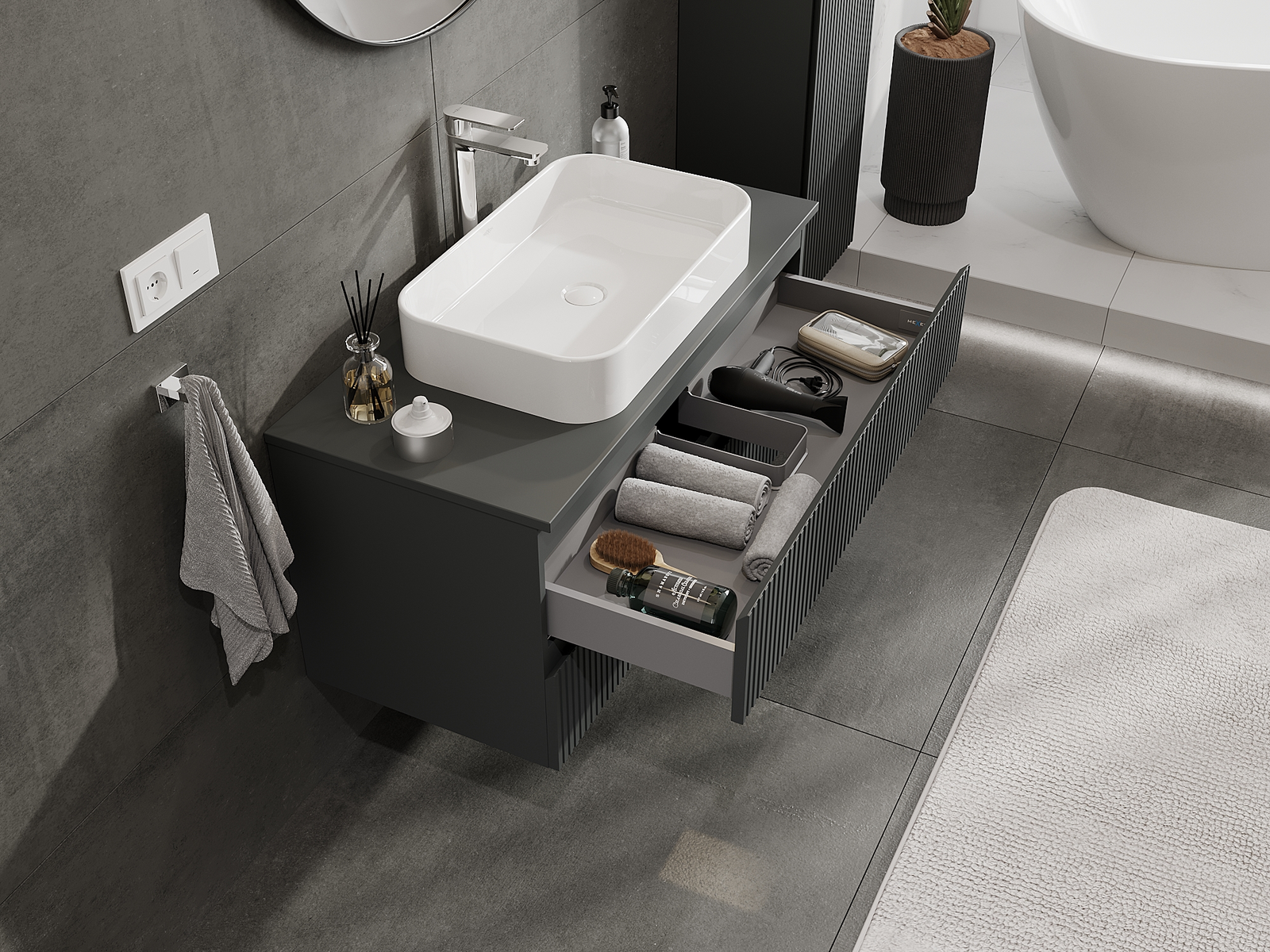 Výrez v zásuvke je navrhnutý tak, aby pojal sifón, ktorý je nevyhnutný v umývadlových inštaláciách. Vďaka tomu môže byť nábytok namontovaný plne funkčne, bez nutnosti vzdávať sa priestoru v zásuvke v prospech inštalácie.