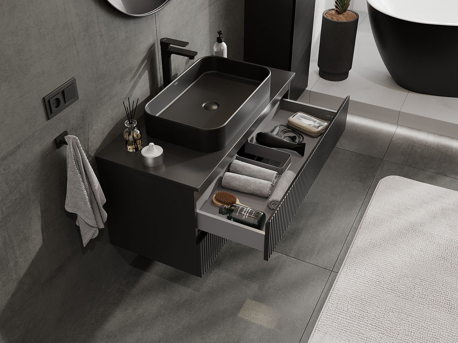 Výrez v zásuvke je navrhnutý tak, aby pojal sifón, ktorý je nevyhnutný v umývadlových inštaláciách. Vďaka tomu môže byť nábytok namontovaný plne funkčne, bez nutnosti vzdávať sa priestoru v zásuvke v prospech inštalácie.