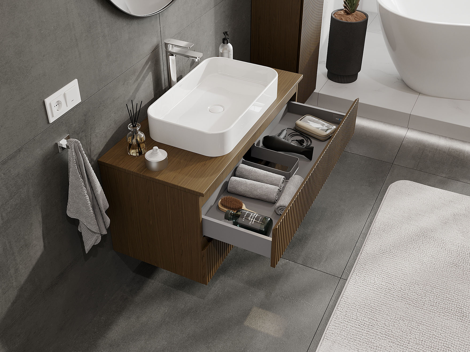 Výrez v zásuvke je navrhnutý tak, aby pojal sifón, ktorý je nevyhnutný v umývadlových inštaláciách. Vďaka tomu môže byť nábytok namontovaný plne funkčne, bez nutnosti vzdávať sa priestoru v zásuvke v prospech inštalácie.