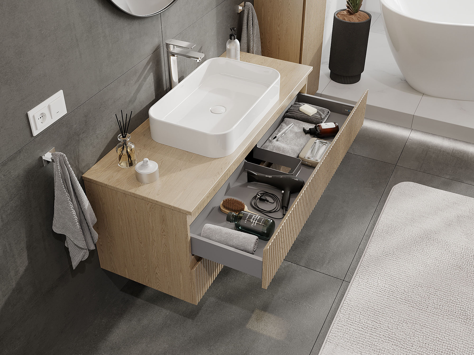 Výrez v zásuvke je navrhnutý tak, aby pojal sifón, ktorý je nevyhnutný v umývadlových inštaláciách. Vďaka tomu môže byť nábytok namontovaný plne funkčne, bez nutnosti vzdávať sa priestoru v zásuvke v prospech inštalácie.