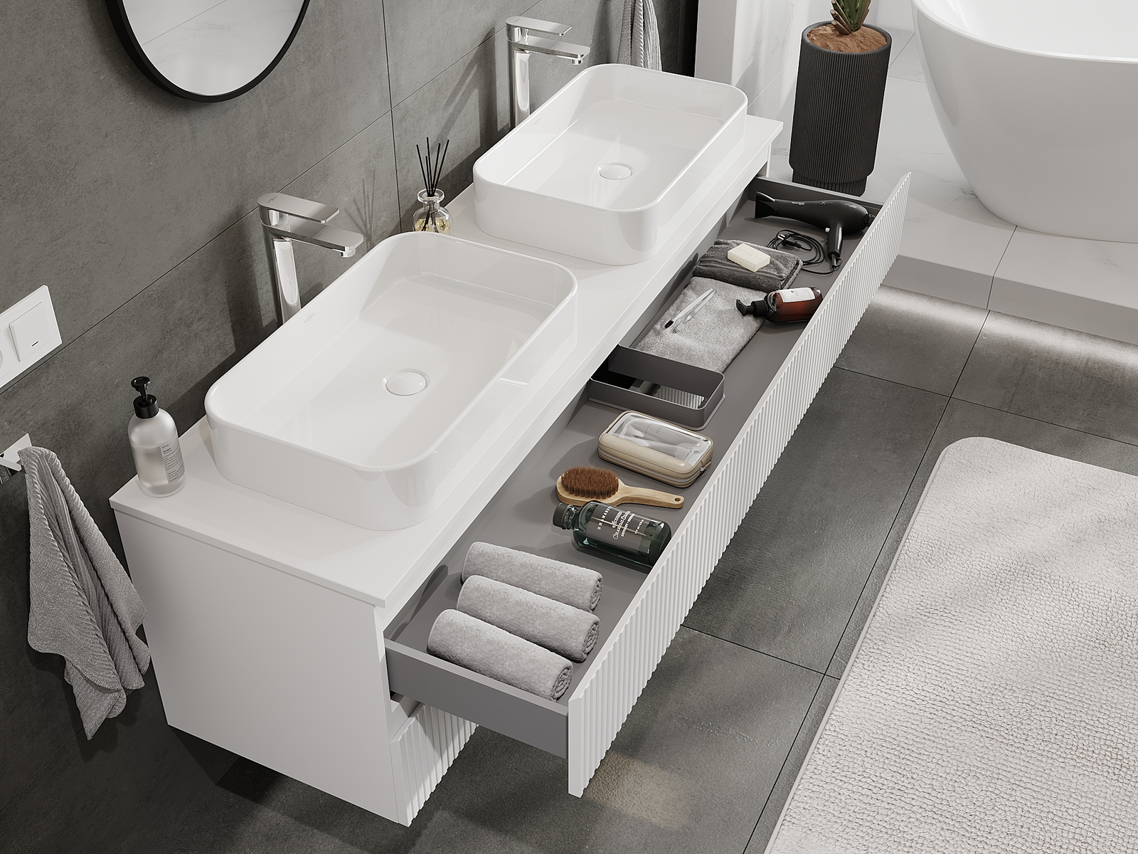 Výrez v zásuvke je navrhnutý tak, aby pojal sifón, ktorý je nevyhnutný v umývadlových inštaláciách. Vďaka tomu môže byť nábytok namontovaný plne funkčne, bez nutnosti vzdávať sa priestoru v zásuvke v prospech inštalácie.