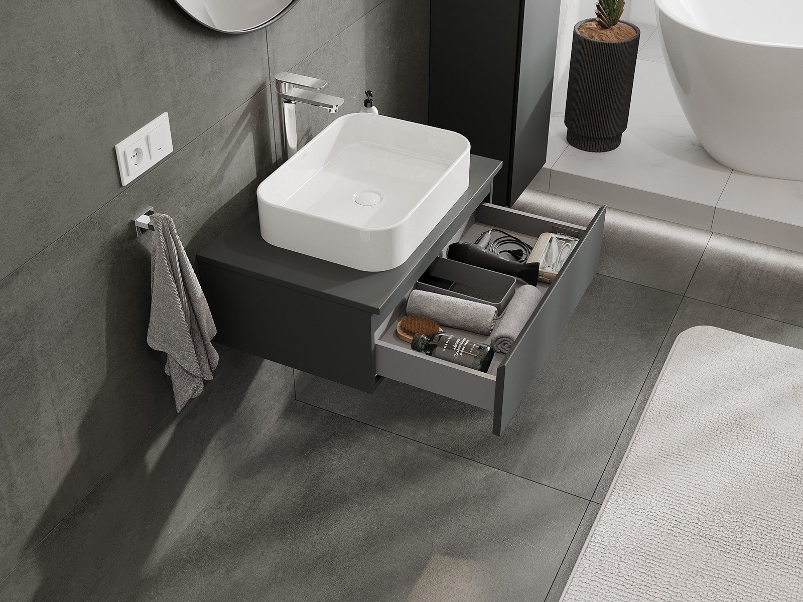 Výrez v zásuvke je navrhnutý tak, aby pojal sifón, ktorý je nevyhnutný v umývadlových inštaláciách. Vďaka tomu môže byť nábytok namontovaný plne funkčne, bez nutnosti vzdávať sa priestoru v zásuvke v prospech inštalácie.