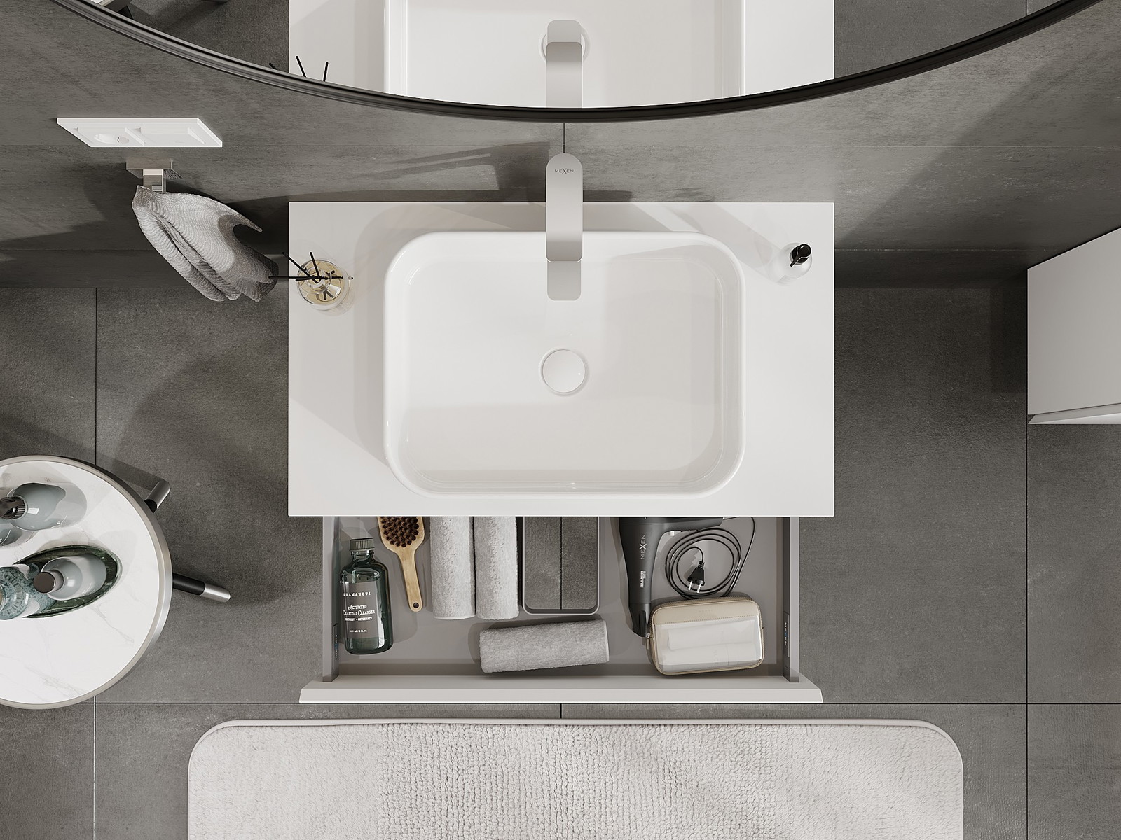 Výrez v zásuvke je navrhnutý tak, aby pojal sifón, ktorý je nevyhnutný v umývadlových inštaláciách. Vďaka tomu môže byť nábytok namontovaný plne funkčne, bez nutnosti vzdávať sa priestoru v zásuvke v prospech inštalácie.