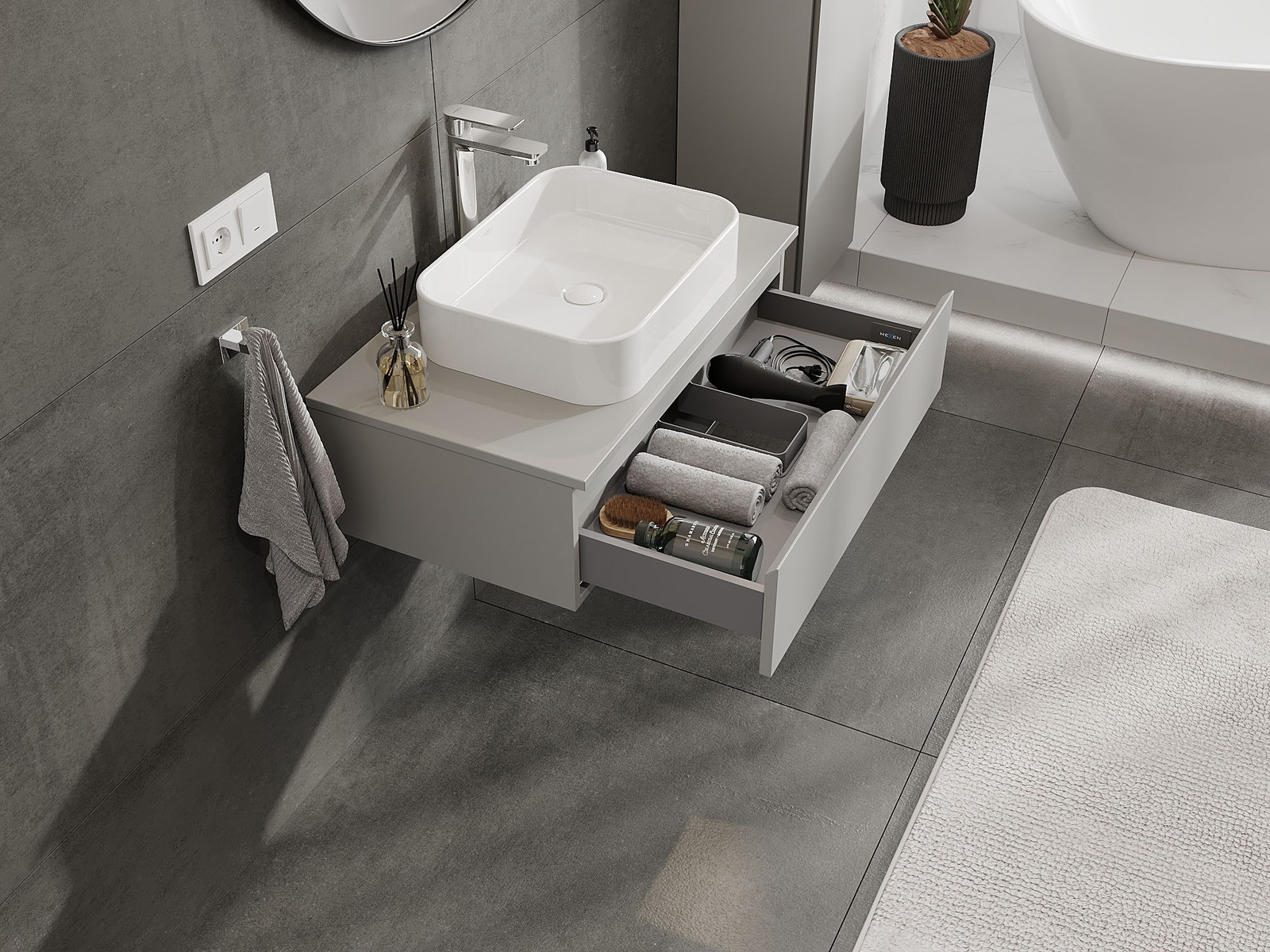 Výrez v zásuvke je navrhnutý tak, aby pojal sifón, ktorý je nevyhnutný v umývadlových inštaláciách. Vďaka tomu môže byť nábytok namontovaný plne funkčne, bez nutnosti vzdávať sa priestoru v zásuvke v prospech inštalácie.