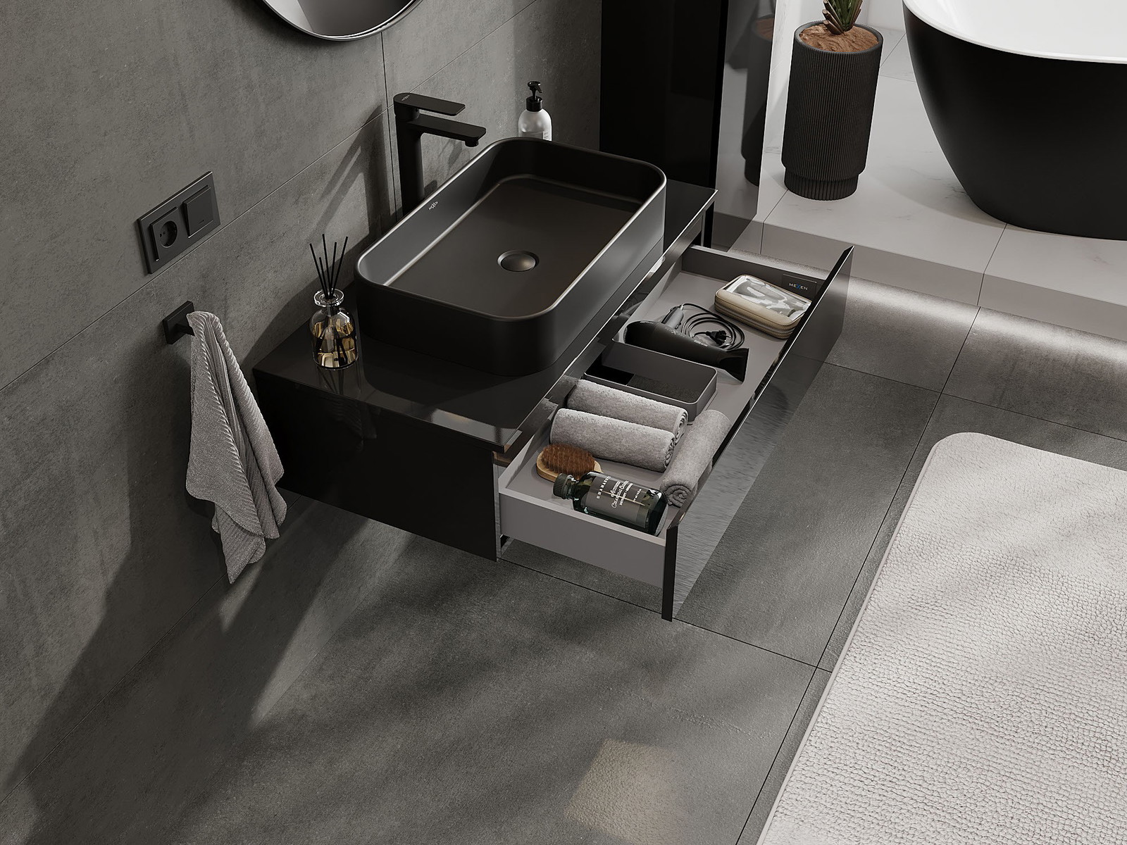 Výrez v zásuvke je navrhnutý tak, aby pojal sifón, ktorý je nevyhnutný v umývadlových inštaláciách. Vďaka tomu môže byť nábytok namontovaný plne funkčne, bez nutnosti vzdávať sa priestoru v zásuvke v prospech inštalácie.