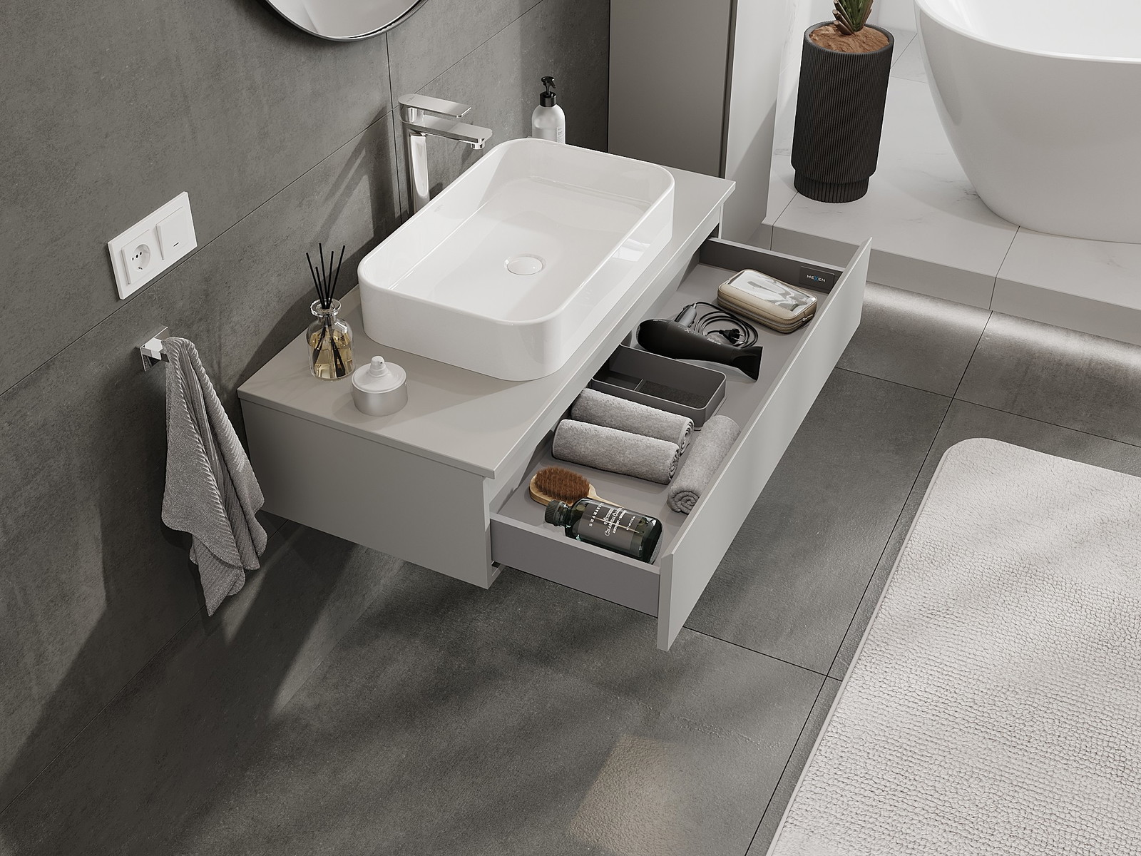 Výrez v zásuvke je navrhnutý tak, aby pojal sifón, ktorý je nevyhnutný v umývadlových inštaláciách. Vďaka tomu môže byť nábytok namontovaný plne funkčne, bez nutnosti vzdávať sa priestoru v zásuvke v prospech inštalácie.